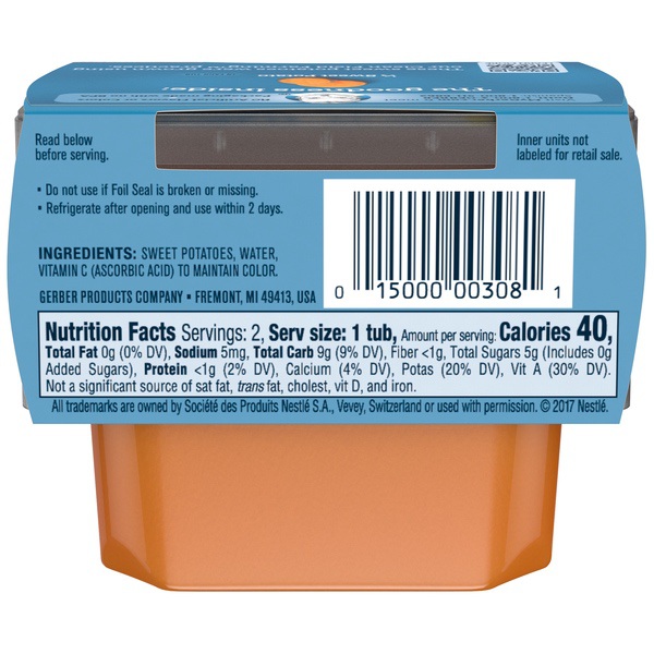 Details Ingredients Sweet Potatoes, Water, Vitamin C (Ascorbic Acid) to Maintain Color. Product features Gerber Baby Food 1st Foods Sweet Potato Non GMO. For supported sitters. Made with sweet potatoes, which are grown using our clean field farming practices. It contains no artificial flavors or colors. This product is not made with genetically engineered ingredients. Gerber® Baby Food 1st Foods Sweet Potato Non GMO. Supported sitter. 2 Packs of 2 oz (56 g). Net Wt 4 oz (113 g). NON-GMO Net Quantity of Content 2.0 X 1 tub