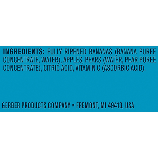 Details Ingredients Fully Ripened Bananas (banana Puree Concentrate, Water), Apples, Pears (water, Pear Puree Concentrate), Citric Acid, Vitamin C (Ascorbic Acid). Show more Product features Continue your baby's love for fruits and vegetables with Gerber 2nd Foods. Gerber 2nd Foods help expose babies to a variety of tastes and ingredient combinations which is important to help them accept new flavors. Gerber 2nd Foods are made with fruits and vegetables that meet Gerber's high quality standards and have the perfect texture for your little one. Gerber 2nd Foods are unsweetened, unsalted, have no added starch and no artificial flavors or colors. Gerber 2nd Foods Banana Apple Pear, 4 Ounce Tubs - Pack of 2 Made with natural fruit - Ingredients carefully selected to meet Gerber high quality standards Unsweetened, unsalted, no added starch, no artificial flavors or colors Age appropriate texture and nutrition that has an excellent source of Vitamin C Gerber is a leader in infant and early childhood nutrition. Have questions? We are awake when you are 24/7: 1-800-284-9488 Special Features Natural Net Quantity of Content 2.0 X 1 Tub