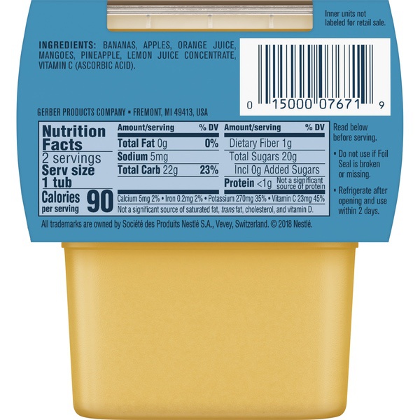 Details Ingredients Bananas, Apples, Orange Juice, Mangoes, Pineapple, Lemon Juice Concentrate, Vitamin C. Product features Continue your baby's love for fruits and vegetables with Gerber 2nd Foods. Gerber 2nd Foods help expose babies to a variety of tastes and ingredient combinations which is important to help them accept new flavors. Gerber 2nd Foods are made with fruits and vegetables that meet Gerber's high quality standards and have the perfect texture for your little one. Gerber 2nd Foods are unsweetened, unsalted, have no added starch and no artificial flavors or colors. Gerber 2nd Foods Banana Orange Medley, 4 Ounce Tubs - Pack of 2 Made with natural fruit - Ingredients carefully selected to meet Gerber high quality standards Unsalted, no added starch, no artificial flavors or colors Age appropriate texture and nutrition that has an excellent source of Vitamin C Gerber is a leader in infant and early childhood nutrition. Have questions? We are awake when you are 24/7: 1-800-284-9488 Special Features Natural Net Quantity of Content 2.0 X 1 Tub