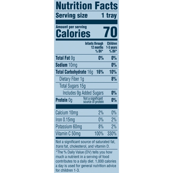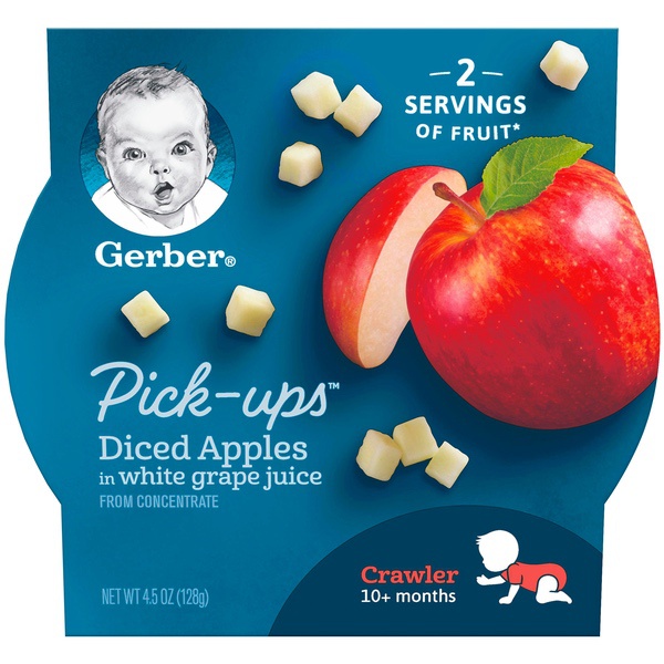 Details Ingredients Apples, White Grape Juice (Water, White Grape Juice Concentrate), Vitamin C (Ascorbic Acid). Product features For a convenient way to serve your little one fruit, try Gerber Fruit Pick-Ups Diced Apples! We make just the right sized pieces that are easy to hold, chew and swallow. Our fruit dices also complement any of your little one's meals and make a healthy snack. One (1) 4.5 oz tray Tray not made with BPA Contains no artificial colors or flavors Offers 2 servings of fruit Head to MyGerber.com to meet Dotti, your on-call personal baby expert, or call us anytime 24/7 at 1-800-284-9488 Special Features Yes Net Quantity of Content 1.0 X 1 Tray Infants through 12 months
