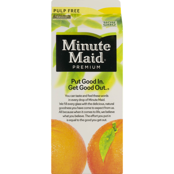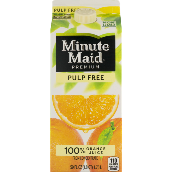 Details Ingredients 100% ORANGE JUICE FROM CONCENTRATE CONTAINS PURE FILTERED WATER, PREMIUM CONCENTRATED ORANGE JUICE. Product features Minute Maid® Premium Orange Juice Pulp Free. 100% orange juice. You can taste and feel these words in every drop of Minute Maid. We fill every glass with the delicious, natural goodness you have come to expect from us. All because when it comes to life, we believe what you believe. No added sweeteners or preservatives. Our quality promise assures your satisfaction. Minute Maid® Premium Pulp Free. 100% orange juice. From concentrate. 110 calories per 8 fl oz serving. 59 fl oz (1.8 QT) 1.75 L. Kosher Net Quantity of Content 7 X 8 fl oz