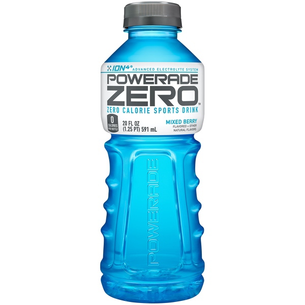 Details Ingredients Water, Citric Acid, Salt, Monopotassium Phosphate, Magnesium Chloride, Calcium Chloride, Natural Flavors, Sucralose, Acesulfame Potassium, Vitamin B3, Vitamin B6, Vitamin B12, Blue 1, Ascorbic Acid, Calcium Disodium EDTA. Show more Product features The ION4 Advanced Electrolyte System helps replenish four electrolytes lost in sweat. POWERADE is formulated with a 6% carbohydrate solution to help provide energy to working muscles, and vitamins B3, B6 and B12. Naturally flavored sports drink with B3, B6 and B12.Helps replenish four key electrolytes lost in sweatEight (8), 20 fl. Oz. bottles of Mixed Berry Zero flavored sports drink with vitamins B3, B6 and B12Zero caloriesFormulated with B-vitamins Special Features Zero calories with electrolytes Net Quantity of Content 8 X 1 Bottle