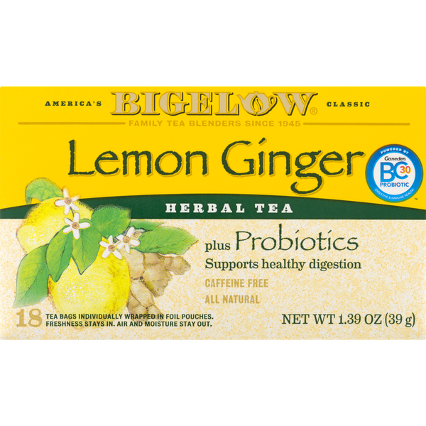 Details Ingredients Lemongrass, Lemon Peel, Cinnamon, Natural Ginger and Lemon Flavors with other Natural Flavors (Soy Lecithin), Lemon Verbena, Rose Hips, Ginger, Licorice Root, GanedenBC30® (Bacillus coagulans GBI-30, 6086), Citric Acid. Show more Product features This recipe not only taste delicious, it's good for your digestion too. Our zesty blend of lemon and ginger has been combined with the probiotic BC 30, an innovation that helps maintain a healthy balance in your digestive tract when used as part of a balanced diet. Herbal Tea, Lemon Ginger, Caffeine Free, Bags 18 tea bags individually wrapped in foil pouches. Freshness stays in. Air and moisture stay out. Plus probiotics. Supports healthy digestion. All natural. Powered by Ganeden BC30 probiotic. Digestive & immune health. Family tea blenders since 1945. It's Easy Being Green: Here at Bigelow Tea, our commitment to the environment is a top priority! Each of our facilities has a dedicated green team focused on identifying ways to become more environmentally sensitive, from installing solar panels at our headquarters to enforcing company-wide composting & recycling programs. We were thrilled when our three manufacturing facilities recently achieved zero waste to landfill status. We are also extremely proud of the fact that, in 2003, we purchased the Charleston Tea Plantation in Wadmalaw Island, South Carolina. We were able to preserve 127 acres of beautiful tea bushes. The tea produced from these bushes is used exclusively for a special line of teas call American Classic Tea. Today the farm is thriving and has over 60,000 visitors a year. At Bigelow we are 100% committed to protecting the environment now, and for generations to come! - The Bigelow Family. Unlock the Freshness - Here's the Key: We use a special foil pouch to protect your tea from any air, moisture and surrounding aromas. So open and enjoy the unparalleled flavor, freshness, aroma of Bigelow Tea everywhere you go! Caff-O-Meter (Represents average caffeine content; individual products may vary): coffee - 100-120 mg; black tea - 30-60 mg; green tea - 25-50 mg; decaf tea - 1-8 mg; herbal tea - 0 mg. Our Promise: We're fully committed to your satisfaction and we love to hear from you! When you do call, please share the code number on this box with the Consumer Service crew. RC Bigelow, Inc; Attn: Consumer Services Group; Fairfield, CT 06825-5512; 1-888-Bigelow; bigelowtea.com. We're Proud of Our Recipe: This recipe not only tastes delicious, it's good for your digestion too. Our zesty blend of lemon and ginger has been combined with the probiotic BC 30, an innovation that helps maintain a healthy balance in your digestive tract when used as part of a balanced diet. Gluten free. Our boxes, tea bags, strings and tags are 100% biodegradable and we encourage you to do your part. Thanks! Blended and packaged in the USA. Special Features