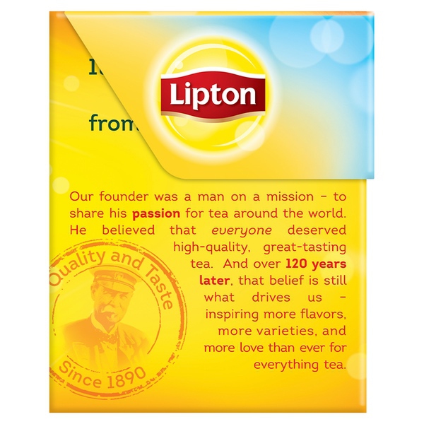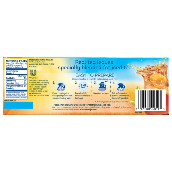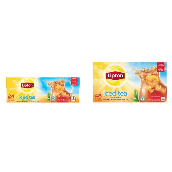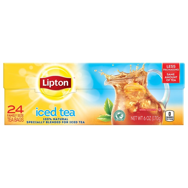 Details Ingredients Orange Pekoe, Pekoe Cut Black Tea Product features Easily brew crisp, refreshing Lipton black iced tea from these convenient family-size bags!. Using real tea leaves specially blended for iced tea, our Master Blenders crafted this refreshingly delicious blend, where we pick tea leaves at the peak of flavor and blend them to capture as much natural tea taste and aroma as possible. Lipton iced tea is the perfect addition for any of your meals because is naturally tasty and refreshing. So don’t just default to the usual, enjoy the superior taste of fresh-brewed tea and choose Lipton Iced Tea.For 1 gallon iced tea pitcher: simply brew two tea bags with 1 quart boiling water, brew 3 minutes, sweeten, add 3 quarts of fresh cold water and ice. Then sip and let great-tasting Lipton black iced tea brighten your day!To capture as much of the tea taste and aroma as possible, we have developed and innovative process where we press fresh, high-quality tea leaves to release their natural essence. We then use this essence on our blend.All our tea bags are 100% sustainably sourced, which translates into ensuring decent wages for tea farmers around the world together with access to quality housing, education and medical care. Your tea is their brighter future. Lipton Unsweetened Family Black Iced Tea Bags, 24 ct Refreshing Lipton black iced tea from these convenient family-size bags Made with real tea leaves specially blended for iced tea Naturally Tasty & Refreshing Lipton Black Iced Tea is the perfect addition to any meal Simply brew with boiling water, sweeten and add ice cubes Lipton Black Tea is made with only 100% Rainforest Alliance certified tea bags Makes 12 gallon iced tea pitchers Special Features 100% natural Net Quantity of Content 96 X 1.8 G