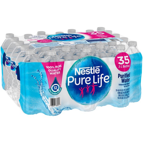 Details Ingredients Purified Water, Less than 0.5% of Calcium Chloride, Sodium Bicarbonate, Magnesium Sulfate. Product features As the #1 bottled water brand in the United States, Nestle Pure Life is on a mission to help families lead healthier lives through proper hydration. Our commitment to excellence is put into practice every day, as our water undergoes a 12-step quality process. Then, we enhance our purified water with a unique blend of minerals for great taste. So make NESTLE PURE LIFE bottled water part of your family’s routine. It’s an easy, effective way to help adopt a healthier lifestyle. 16.9-ounce/.5-Liter plastic bottles, perfect to take for lunch or bring to workHandy 35-Pack: stock up for everyday family needs or large family gatheringsZero calories, no sweeteners and no artificial colors or flavors: a healthy alternative to sugary drinksNESTLE PURE LIFE is serious about water quality, which is why our water undergoes a 12-step quality processIts clean, crisp taste makes it a family favoriteNESTLE PURE LIFE is an easy and effective way to help your family adopt a healthier lifestyle Net Quantity of Content 2.5 X 8 Oz