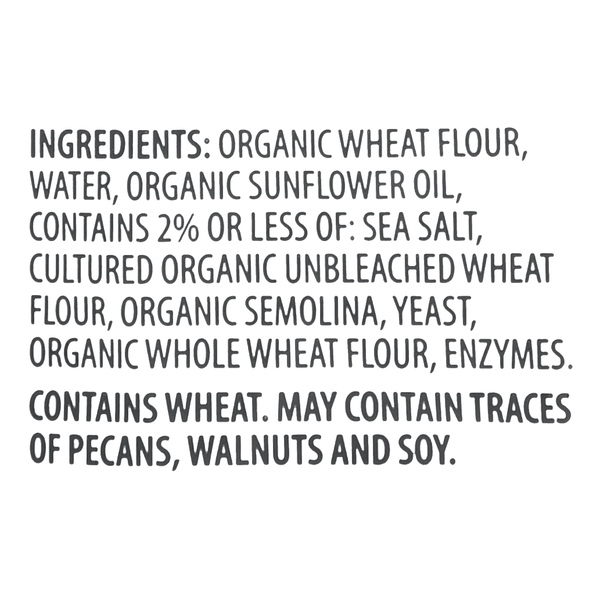 Details Ingredients Organic Wheat Flour, Water, Organic Sunflower Oil, Contains 2% or Less of: Sea Salt, Cultured Organic Unbleached Wheat Flour, Organic Semolina, Yeast, Organic Whole Wheat Flour, Enzymes. Show more Product features Marketside Organic Bake at Home Sourdough Boule is a delicious loaf of bread that delivers fresh bakery flavors in the comfort of your home. Our breads are crafted and baked in-house and deliver delicious authentic Italian flavors. Use it to make a hand crafted bread bowl filled with your favorite soup or stew. Heat it and enjoy it as a delicious side to a plate of creamy pasta and roasted vegetables. It is great for health conscious individuals as it is USDA organic. Start your dinner off right with the unique flavors and artisanal quality of Marketside Organic Bake at Home Sourdough Boule. Fresh ideas and quality ingredients, that's how Marketside brings the best foods to your table. We are committed to deliver freshness that you can taste and see. Marketside offers the best in fresh food, guaranteed by Walmart, working in partnership with farmers, bakers and chefs for the highest quality, authentic ingredients and favorite recipes. Heating Instructions Preheat oven to 400F. Remove boule from packaging and place on baking sheet. Bake in preheated oven for 14 to 16 minutes or until golden brown. Allow boule to cool before serving. Marketside Organic Bake at Home Sourdough Boule, 18 oz: Bake at home for a fresh, from the bakery taste Perfect for bread bowls or as a side dish USDA organic Net weight 18 oz Net Quantity of Content 9 X 1/9 Loaf (57g)