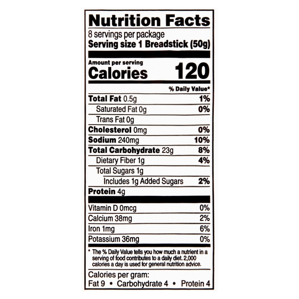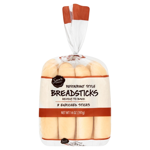 Details Ingredients Enriched unbleached wheat flour (wheat flour, malted barley flour, niacin, reduced iron, thiamine mononitrate, riboflavin, folic acid), water, yeast, salt, high fructose corn syrup, dough conditioners (sodium stearoyl lactylate, ascorbic acid, monocalcium phosphate), calcium suflate, enzymes, calcium propionate and potassium sorbate (mold inhibitors) Show more Product features Sam's Choice Restaurant Style Breadsticks are masterfully made with our traditional recipe. Their soft, chewy texture and rich, wholesome taste make them hard to resist. These crowd-pleasing favorites come unseasoned, so you can make them as sweet or savory as you’d like which makes them perfect for parties, gatherings, or simple, everyday meals. After baking, remove them from the oven, immediately brush with olive oil or melted butter and then sprinkle with a garlic salt blend. If you crave a sweeter taste, brush with melted butter and sprinkle them with a cinnamon sugar blend instead. They also offer nutritional benefits as they are a good source of five minerals. Enjoy restaurant quality breadsticks in the comfort of your home with these Sam's Choice Restaurant Style Breadsticks. Named after our iconic founder, Walmart's Sam's Choice brand provides families with premium, high quality food and grocery options with the best value. With our wide range of products spanning grocery, packaged food, pre-packaged deli, dairy and frozen food, we offer you a tailored assortment that is both innovative and enticing. Our authentic products are inspired by our proud heritage and are trusted today by the millions of customers using them across the nation. Sam's Choice Restaurant Style Breadsticks, 14 oz: Traditional recipe restaurant style breadsticks Ready to bake Unseasoned Bakes in just minutes Net Quantity of Content 8 X 50 g