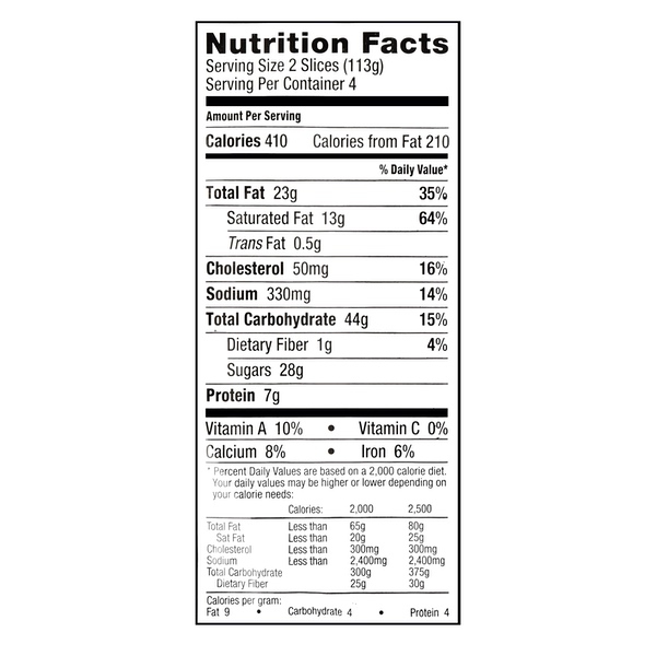 Details Ingredients Cream Cheese (Milk, Cream, Bacterial Culture, Salt, Carob Bean Gum), Sugar, Enriched Bleached Wheat Flour (Flour, Malted Barley Flour, Niacin, Reduced Iron, Thiamine Mononitrate, Riboflavin, Folic Acid), Skim Milk, Milk, Palm Oil, Eggs, Margarine (Soybean Oil, Palm Oil, Water, Salt, Mono- And Diglycerides, Nonfat Dry Milk, Soy Lecithin, Preservative [Sodium Benzoate], Artificial Flavor, Vitamin A Palmitate, Beta-Carotene Color), Graham Flour, Contains Less Than 2% Of The Following: Hydrogenated Coconut Oil, Whey, Brown Sugar, Honey, Rice Flour, Cornstarch, Soybean Oil, Gelatin, Modified Cornstarch, Bacterial Culture, Mono- And Diglycerides, Salt, Natural And Artificial Flavor, Carob Bean Gum, Datem, Baking Soda, Preservative (Potassium Sorbate), Cinnamon, Disodium Phosphate, Modified Tapioca Starch, Sodium Caseinate, Sodium Citrate, Soy Protein Isolate, Xanthan Gum, Soy Lecithin, Beta-Apo-8'-Carotenal Color. Show more Product features The Bakery New York Style Cheesecake is a delicious treat that is sure to fulfil your sweet tooth. This classic cheesecake is baked on a cinnamon brown sugar and honey crust to ensure a mouthful of flavor in every bite. To make an extra special cheese serve with whipped cream, fresh strawberries or cherry topping. It contains eight pre-cut slices so it's perfect for bringing to a friend's house to share, to serve if you are having guests over or for a delicious treat any day. This cheesecakes come in an easy open/close container to help maintain freshness and for you convenience. Make any day sweeter with a slice of The Bakery New York Style Cheesecake. At The Bakery, we prepare your favorite items with pride and care in true Walmart passion, and each bite you take reflects our dedication and skill in baking. The Bakery New York Style Cheesecake, 16 oz, 8 Slices Baked on a cinnamon brown sugar and honey crust Creamy and delicious Can be topped with whipped cream, fresh strawberries or cherries Pre-cut individual slices Perfect to share with friends and guests Special Features Real cream cheese on a traditional graham cracker crust Net Quantity of Content 4.00 X 2 Slices (113g)
