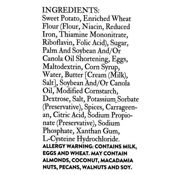 Details Ingredients SWEET POTATO, ENRICHED WHEAT FLOUR (FLOUR, NIACIN, REDUCED IRON, THIAMINE MONONITRATE, RIBOFLAVIN, FOLIC ACID), SUGAR, PALM AND SOYBEAN AND/OR CANOLA OIL SHORTENING, EGGS, MALTODEXTRIN, CORN SYRUP, WATER, BUTTER [CREAM (MILK), SALT], SOYBEAN AND/OR CANOLA OIL, MODIFIED CORNSTARCH, DEXTROSE, SALT, POTASSIUM SORBATE (PRESERVATIVE), SPICES, CARRAGEENAN, CITRIC ACID, SODIUM PROPIONATE (PRESERVATIVE), SODIUM PHOSPHATE, XANTHAN GUM, L-CYSTEINE HYDROCHLORIDE. Show more Product features This one-of-a-kind pie inspired infectious lyrics, sell-out performances and has starred in countless Thanksgiving dinners. Patti Labelle’s exclusive recipe combines a tender, flaky crust and creamy filling made with sweet potatoes, butter, and spice. It’s so delicious, it will make you sing! Patti's Good Life by Patti LaBelle Sweet Potato Pie, 21 oz Net Quantity of Content 5 X 119 g