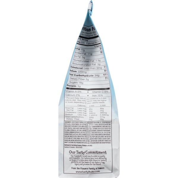 Details Ingredients Confectionery Coating (Sugar, Hydrogenated Palm Kernel Oil, Cocoa Processed with Alkali, Cocoa Powder, Soy Lecithin, Salt, Artificial Flavor), Enriched Bleached and Unbleached Flour (Wheat Flour, Niacin, Reduced Iron, Thiamin Mononitrate, Riboflavin, Folic Acid), Palm Oil, Sugar, Water, Whey (Milk), Nonfat Milk, Contains 2% or Less of Each of the Following: Soybean Oil, Soy Flour, Leavening (Sodium Bicarbonate, Sodium Acid Pyrophosphate, Sodium Aluminum Phosphate), Egg Yolks, Dextrose, Corn Syrup Solids, Salt, Soy Lecithin, Sodium Stearoyl Lactylate, Distilled Monoglycerides, Wheat Starch, Monocalcium Phosphate, Guar Gum, Wheat Gluten, Corn Dextrin, Tapioca Dextrin, Propylene Glycol Mono- and Diesters of Fats and Fatty Acids, Mono- and Diglycerides, Modified Wheat Starch, Sodium Alginate, Karaya Gum, Natural and Artificial, Enzymes, Xanthan Gum, Colored with Turmeric and Annatto, Ascorbic Acid, Preserved with Sorbic Acid, Potassium Sorbate and Sodium Propionate. Show more Product features Tastykake Chocolate Frosted Donuts, 11.5 oz Made Deliciously Since 1914 From the Flowers Family of Bakers Net Quantity of Content 5.0 X 4 Donuts (63g/2.2 oz)