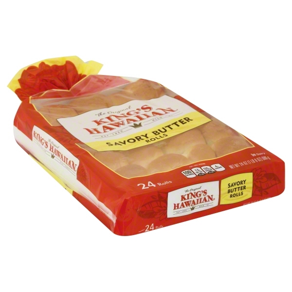 Details Ingredients ENRICHED FLOUR (WHEAT FLOUR, MALTED BARLEY FLOUR, NIACIN, REDUCED IRON, THIAMINE MONONITRATE, RIBOFLAVIN, FOLIC ACID), WATER, SUGAR, BUTTER (PASTEURIZED CREAM, SALT), NONFAT MILK, CONTAINS LESS THAN 2% OF EACH OF THE FOLLOWING: POTATO FLOUR, EGGS, YEAST, DATEM, SALT, WHEY, WHEAT GLUTEN, DEGERMINATED YELLOW CORN FLOUR, SODIUM STEAROYL LACTYLATE, SORBIC ACID PRESERVATIVE, MONOCALCIUM PHOSPHATE, WHEAT FLOUR, CALCIUM SULFATE, ASCORBIC ACID ADDED AS A DOUGH CONDITIONER, WHEAT STARCH, SODIUM SILICOALUMINATE, AMMONIUM SULFATE, ENZYMES, SORBITAN MONOSTEARATE, MONO-& DIGLYCERIDES, CALCIUM SILICATE, MICROCRYSTALLINE CELLULOSE. Show more Product features Rolls, Savory Butter, Bag 24 CT Est. 1950. Per 1 Roll Serving: 100 calories; 1.5 g sat fat (8% DV); 125 mg sodium (5% DV); 4 g sugars. Our Story: In the 1950s in Hilo, Hawaii, a young man named Robert R. Taria had a passion for baking. Working with the finest ingredients, he created bread that was soft, sweet and irresistible. Today, three generations of the Taira family continue the legacy and the aloha spirit, using wholesome ingredients like real butter. Our rolls are wonderful warm from the oven or straight from the bag. Make them into sliders or bite-sized sandwiches. A pack of 24 delicious King's Hawaiian rolls means plenty to go around. Mahalo, from our ohana (family) to yours, The Taira family. Made with real butter. Try our other irresistible products! Jalapeno, honey wheat and original Hawaiian sweet rolls: Irresistible flavors sure to please any crowd! Hot dog buns and hamburger buns: Make any grilling occasion special! For delicious recipe ideas, visit us online at: www.kingshawaiian.com. Consumer Care: (877) My-khcares. (877) 695-4227. Recyclable package. Find us on Facebook and Twitter. Product of USA. Convenient tray for heating. Important: Remove rolls from bag. Leave in oven-safe tray. Place on middle oven rack at 300 degrees F (preheated). For a softer crust, warm in oven for 2-3 minutes. For a crisper crust, warm in oven for 4-5 minutes. Contains: wheat, milk, eggs, soy. 24 rolls [24 oz (1 lb 8 oz) 680 g] 19161 Harborgate Way Torrance, CA 90501 877-MY-KHCARES 2016 King's Hawaiian Holding Co., Inc. Rolls, Savory Butter, Party Pack Per 1 Roll Serving: 90 calories; 1.5 sat fat (8% DV); 115 mg sodium (4% DV); 4 g sugars. No high fructose corn syrup. No artificial dyes. No trans fats. Est. 1950. Hilo, Hawaii. Our Story: Back in the 1950s in Hilo, Hawaii, a man named Robert R. Taira had a passion for baking. He worked tirelessly to create a bread that was soft, sweet and irresistible. After years of making his bread in Hawaii, Robert decided to expand to mainland. Today, the Taira family continues his legacy of creating irresistible products made with Aloha Spirit and enjoyed by millions. Mahalo, The Taira Family. Bring the party to life! Facebook. Pinterest. SmartLabel. Recyclable packages. Product of USA Net Quantity of Content 24 X 28 g
