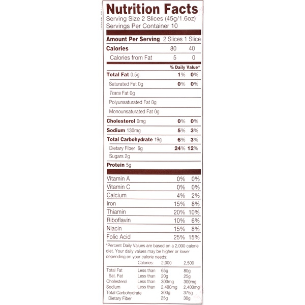 Details Ingredients Water, Unbleached Enriched Flour (Wheat Flour, Malted Barley Flour, Niacin, Reduced Iron, Thiamin Mononitrate, Riboflavin, Folic Acid), Cellulose, Wheat Gluten, Whole Wheat Flour, Yeast, Honey, Contains 2% or Less of Each of the Following: Sugar, Wheat Bran, Cultured Wheat Flour, Salt, Vinegar, Guar Gum, Citric Acid, Monocalcium Phosphate, Sodium Citrate, Ascorbic Acid, Calcium Sulfate, Soy Lecithin, Enzymes, Niacin, Iron (Ferrous Sulfate), Thiamin Hydrochloride, Riboflavin, Folic Acid, Natamycin (to Retard Spoilage). Show more Product features At Nature's Own, we believe in getting the most out of life. From the foods we eat to the breads we make, we want our products to not only be delicious to the last bite, but also deliver on some very specific dietary choices. That's why our new line of Nature's Own Life™ breads is designed to do just that. Great tasting breads like our... 40 Calorie: Honey Wheat Know Your Grains – Wheat and whole grains are nutritious and delicious! Nature's Own offers a wide range of tastes, textures, and nutritional benefits. To include whole grain and whole wheat in your diet, explore product options like: 100% Whole Wheat, 100% Whole Wheat with Honey, 100% Whole Grain and Sugar Free 100% Whole Grain. All four of which are a source of whole grains. Live the Good. Life #1 Selling Bread Brand** Net Quantity of Content 10.0 X 2 Slices (45g/1.6oz)