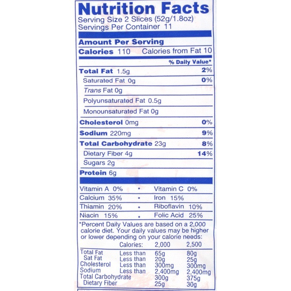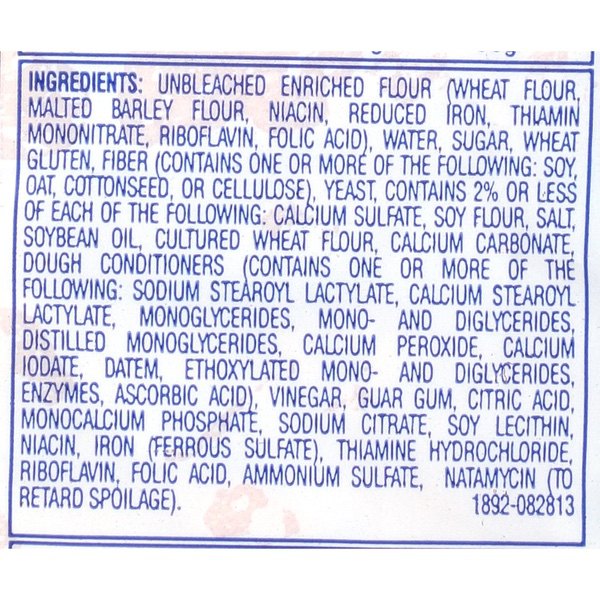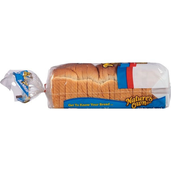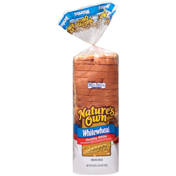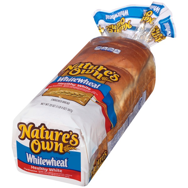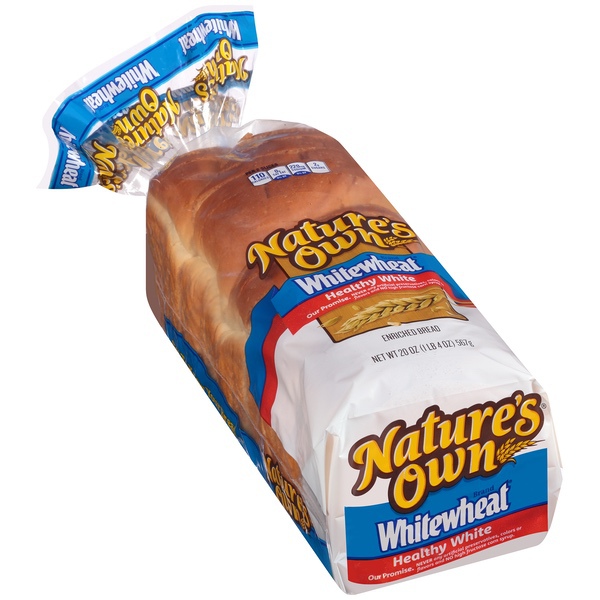Details Ingredients Unbleached Enriched Flour (Wheat Flour, Malted Barley Flour, Niacin, Reduced Iron, Thiamin Mononitrate, Riboflavin, Folic Acid), Water, Sugar, Wheat Gluten, Fiber (Contains One or More of the Following: Soy, Oat, Cottonseed or Cellulose), Yeast, Contains 2% or Less of Each of the Following: Calcium Sulfate, Soy Flour, Salt, Soybean Oil, Cultured Wheat Flour, Calcium Carbonate, Dough Conditioners (Contains One or More of the Following: Sodium Stearoyl Lactylate, Calcium Stearoyl Lactylate, Monoglycerides, Mono- and Diglycerides, Distilled Monoglycerides, Calcium Peroxide, Calcium Iodate, DATEM, Ethoxylated Mono- and Diglycerides, Enzymes, Ascorbic Acid), Vinegar, Guar Gum, Citric Acid, Monocalcium Phosphate, Sodium Citrate, Soy Lecithin, Niacin, Iron (Ferrous Sulfate), Thiamine Hydrochloride, Riboflavin, Folic Acid, Ammonium Sulfate, Natamycin (to Retard Spoilage). Show more Product features Goodness is in Our Nature! At Nature's Own, we pride ourselves on doing things the way we believe they ought to be done. Which is why we promise that our breads are never made with any artificial preservatives, colors or flavors and no high fructose corn syrup. After all, we live by our pledge – if we wouldn't serve it to our family we would never serve it to yours. To demand any less just wouldn't be in our nature. #1 Selling Bread Brand* Special Features Cholesterol free Net Quantity of Content 11.0 X 2 Slices (52g/1.8oz)
