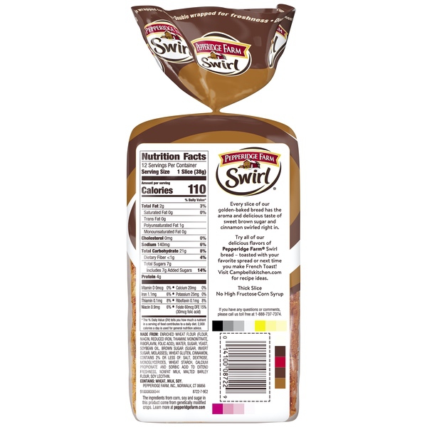 Details Ingredients Made From: Enriched Wheat Flour (Flour, Niacin, Reduced Iron, Thiamine Mononitrate, Riboflavin, Folic Acid), Water, Sugar, Yeast, Soybean Oil, Brown Sugar (Sugar, Invert Sugar, Molasses), Wheat Gluten, Cinnamon, Contains 2% Or Less Of: Salt, Dextrose, Monoglycerides, Wheat Starch, Calcium Propionate And Sorbic Acid To Extend Freshness, Nonfat Milk, Malted Barley Flour, Soy Lecithin. Contains: Wheat, Milk, Soy. Show more Product features Welcome the day with a slice of delicious Pepperidge Farm Brown Sugar Cinnamon Swirl Bread. Every slice of our golden-baked, wholesome bread has the aroma and delicious taste of brown sugar and cinnamon swirled right in. From our oven to your toaster, it's the perfect way to start your family's day. Brown Sugar Cinnamon Swirl Bread One loaf, thick sliced bread Low fat, cholesterol free, and 0g trans fat per serving 16 oz. bag, double wrapped for freshness The perfect way to start your family's day Special Features Cholesterol free Net Quantity of Content 12.0 X 1 Slice (38g)