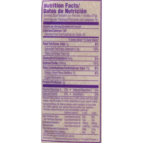 Details Ingredients ENRICHED BLEACHED WHEAT FLOUR (WHEAT FLOUR, NIACIN, REDUCED IRON, THIAMINE MONONITRATE, RIBOFLAVIN, FOLIC ACID), WATER, VEGETABLE SHORTENING (INTERESTERIFIED SOYBEAN OIL, HYDROGENATED SOYBEAN OIL AND/OR PALM OIL), CONTAINS 2% OR LESS OF: SALT, LEAVENING (SODIUM BICARBONATE, SODIUM ALUMINUM SULFATE, CORN STARCH, MONOCALCIUM PHOSPHATE AND/OR SODIUM ACID PYROPHOSPHATE, CALCIUM SULFATE), PRESERVATIVES (CALCIUM PROPIONATE, SORBIC ACID AND/OR CITRIC ACID), DOUGH CONDITIONERS (FUMARIC ACID, SODIUM METABISULFITE AND/OR MONO- AND DIGLYCERIDES). Show more Product features Guerrero Fresqui-Ricas Ready to Cook Fajita Flour Tortillas make it easy to get the taste of authentic, homemade tortillas without all the work. Simply heat our tortillas up in a hot skillet, and they're ready to serve in just 90 seconds. We craft our kosher tortillas using high quality ingredients and time-tested techniques, and they never contain any lard, trans fat, or cholesterol. We recommend stuffing our Fresqui-Ricas tortillas with seasoned ground beef and queso fresco for a delicious batch of empanadas. Includes one 16 ct package of Guerrero Fresqui-Ricas Ready to Cook Fajita Flour Tortillas. One 16 count package of Guerrero Fresqui-Ricas Ready to Cook Fajita Flour Tortillas Cooks in just 90 seconds Certified kosher 0g of trans fat per serving No cholesterol or lard Special Features 0G trans fat per serving Net Quantity of Content 16 X 37 g
