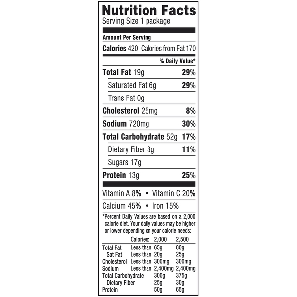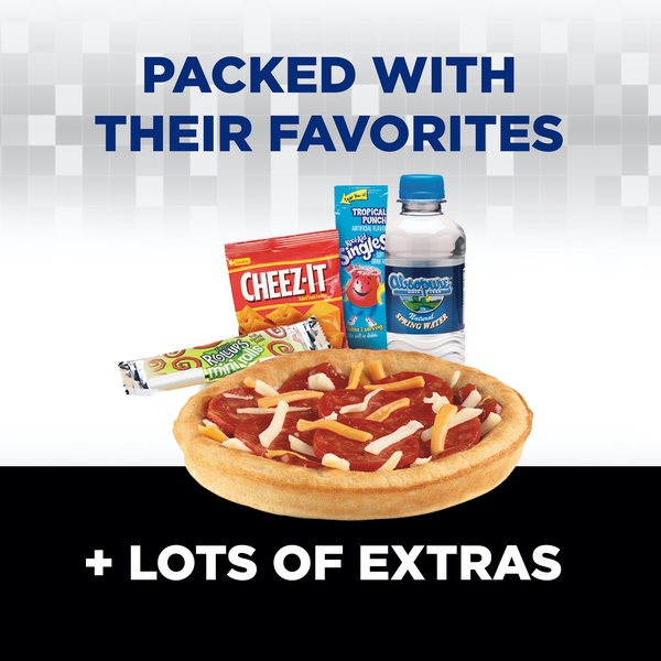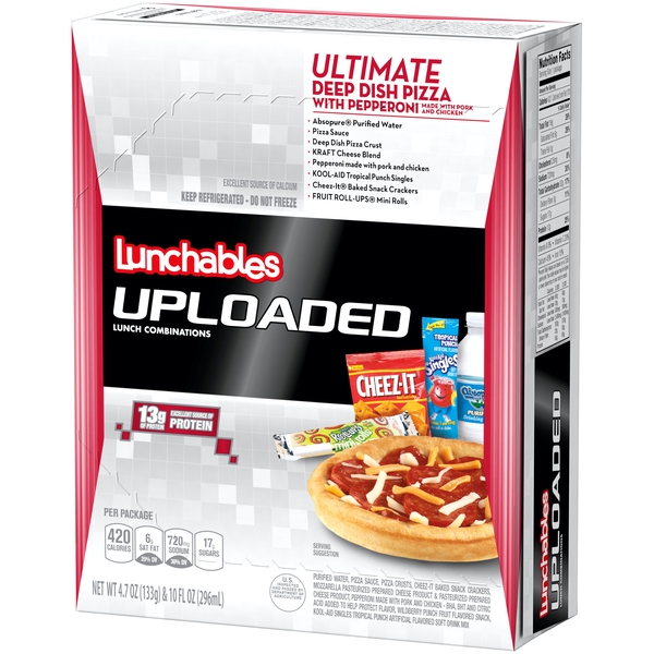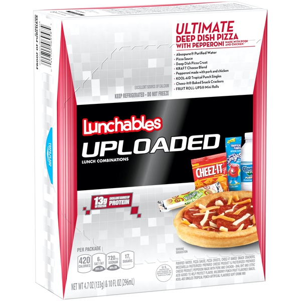 Details Ingredients Purified Water; Pizza Sauce (Water, Tomato Paste, Sugar, Contains Less Than 2% Of Food Starch Modified, Garlic Powder, Salt, Onion Powder, Spice, Citric Acid, Dried Basil, Sea Salt, Sodium Benzoate And Potassium Sorbate [Added As Preservatives], Xanthan Gum, Natural Flavor); Pizza Crust (Enriched Flour [Wheat Flour, Niacin, Reduced Iron, Thiamine Mononitrate, Riboflavin, Folic Acid], Water, Whole Wheat Flour, Soybean Oil, Yeast, Sugar, Contains 2% Or Less Of: Reduced Sodium Salt Blend [Salt, Potassium Chloride, Natural Flavor], Dough Conditioner [Whey, L Cysteine], Vital Wheat Gluten, Natural And Artificial Flavors, Mono Diglycerides, Sodium Stearoyl Lactylate, Rice Bran Extract, Calcium Propionate, Dough Conditioner [Enriched Wheat Flour (Wheat Flour, Niacin, Reduced Iron, Thiamine Mononitrate), Enzymes], Dehydrated Garlic, Cellulose Powder), Contains: Wheat, Milk); Baked Snack Crackers (Enriched Flour [Wheat Flour, Niacin, Reduced Iron, Thiamin Mononitrate (Vitamin B1), Riboflavin (Vitamin B2), Folic Acid], Vegetable Oil [Soybean And Palm Oil With Tbhq For Freshness], Cheese Made With Skim Milk [Skim Milk, Whey Protein, Cheese Cultures, Salt, Enzymes, Annatto Extract For Color], Contains Two Percent Or Less Of Salt, Paprika, Yeast, Paprika Oleoresin For Color, Soy Lecithin), Contains: Wheat, Milk And Soy; Cheese Blend (Mozzarella Pasteurized Prepared Cheese Product [Pasteurized Part Skim Milk, Water, Milk Protein Concentrate, Milkfat, Salt, Cheese Culture, Sodium Citrate, Sorbic Acid As A Preservative, Enzymes, With Cellulose Powder Added To Prevent Caking], Pasteurized Prepared Cheese Product [Pasteurized Part Skim Milk, Water, Milk Protein Concentrate, Milkfat, Contains Less Than 2% Of Salt, Cheese Culture, Sodium Citrate, Sorbic Acid As A Preservative, Apocarotenal (Color), Enzymes, Cellulose Powder Added To Prevent Caking]), Contains: Milk; Pepperoni Made With Pork And Chicken (Pork, Mechanically Separated Chicken, Salt, Contains 2% Or Less Of Pork Stock, Spices [Including Mustard], Dextrose, Lactic Acid Starter Culture, Oleoresin Of Paprika, Flavoring, Sodium Ascobate, Sodium Nitrite, Bha, Bht, Citric Acid); Wildberry Punch Fruit Flavored Snack (Corn Syrup, Dried Corn Syrup, Sugar, Pear Puree Concentrate, Palm Oil, Contains 2% Or Less Of: Citric Acid, Sodium Citrate, Fruit Pectin, Monoglycerides, Malic Acid, Dextrose, Vitamin C [Ascorbic Acid], Acetylated Monoglycerides, Natural Flavor, Color [Red 40, Yellows 5&6, Blue1]); Tropical Punch Artificial Flavored Soft Drink Mix (Sugar, Fructose, Citric Acid, Contains Less Than 2% Of Ascorbic Acid [Vitamin C], Natural And Artificial Flavor, Acesulfame Potassium And Sucralose [Sweeteners], Calcium Phosphate, Artificial Color, Red 40, Blue 1, Bha [Preserves Freshness]). Show more Product features Lunchables Uploaded Ultimate Deep Dish Pizza with Pepperoni is the perfect choice for an on the go lunch. This convenient box lunch includes deep dish pizza crust, pizza sauce, pepperoni slices made with pork, chicken and beef and Kraft cheese blend to build a tasty personal pizza lunch or snack. It's also packed with Cheez-It baked snack crackers, Fruit Roll-Ups mini roll, Absopure spring water and Kool-Aid Tropical Punch single. This pizza meal kit makes a delicious, convenient and fun option for school, picnics or on the go lunch. It provides an excellent source of protein, with 13 grams per serving. This 14.7 ounce Lunchables Uploaded comes packaged in a convenient, easy-open box. One 14.7 oz. Lunchables Uploaded Ultimate Deep Dish Pizza with Pepperoni Lunchables Uploaded is packed with kids' favorites, giving more choices for lunchtime Contains deep dish pizza crust, pizza sauce, pepperoni slices and Kraft cheese blend Includes Cheez-It baked snack crackers and Fruit Roll-Ups mini rolls This complete ready to eat meal is perfect for school lunch Excellent source of protein with 13 g. per serving Keep the convenient on the go package refrigerated Net Quantity of Content 1.0 X 1 package