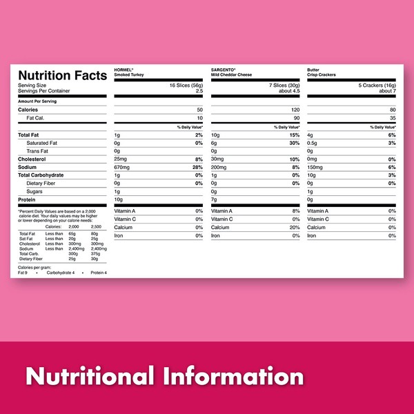 Details Ingredients Hormel Smoked Turkey (Turkey Breast, Turkey Broth, Salt, Sugar, Modified Food Starch, Sodium Phosphates, Sodium Ascorbate, Sodium Nitrite). Sargento Mild Cheddar Cheese (Pasteurized Milk, Cheese Culture, Salt, Enzymes, Annatto [Vegetable Color], Potato Starch and Powdered Cellulose [to Prevent Caking], Natamycin [a Natural Mold Inhibitor]). Butter Crisp Crackers (Enriched Flour [Wheat Flour, Niacin, Reduced Iron, Thiamine Mononitrate {Vitamin B1}, Riboflavin {Vitamin B2}, Folic Acid], Soybean Oil with TBHQ for Freshness, Sugar, Contains 2% or Less of Salt, Corn Syrup, Leavening [Baking Soda, Sodium Acid Pyrophosphate, Monocalcium Phosphate], Malt Extract, Butter [Cream {Milk}, Salt], Cornstarch, Annatto Color, Soy Lecithin). Show more Product features Slices of pre-cut HORMEL Smoked Turkey, SARGENTO Cheddar Cheese and Butter Crisp Crackers join forces to create HORMEL GATHERINGS Turkey and Cheese Snack Tray: the perfect, easy, and classic snack adults and kids all love. Spend less time in the kitchen and more time gathering with friends and family by unwrapping the unparalleled freshness and convenience of the snack platter. Keep one on hand for every afternoon snack emergency. HORMEL GATHERINGS is a trademark or HORMEL FOODS, LLC. PREMIUM INGREDIENTS: Butter crackers, sliced natural smoked turkey with high-quality cheddar cheese stack together for a delicious snack ON-THE-GO: For a fresh, quick lunch or snack on busy days, grab and pack the snack tray for yummy meals on-the-go without running behind schedule TRAVEL: Easily tuck into a cooler or pack and head down the trail, river, or slope with the wholesome, filling, refueling snack tray SNACK: When making dinner, prepping a holiday meal or hosting, enjoy a quick, easy appetizer and teaser to the main course COMPLETE THE PARTY: Gather in celebration with great food and even better company. Adorn the party with one of the best snack trays on the market Special Features PREMIUM INGREDIENTS: Butter crackers, sliced natural smoked turkey with high-quality cheddar cheese stack together for a delicious snack Net Quantity of Content 2.5 X 56.00 g