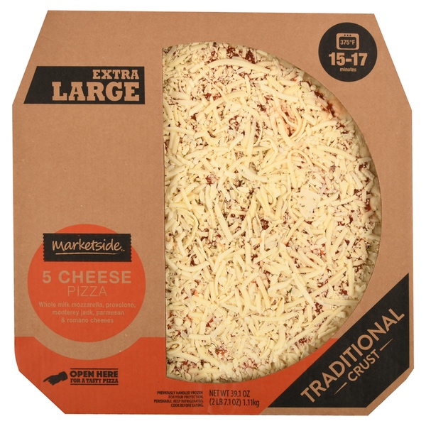 Details Ingredients Crust (unbleached enriched wheat flour [wheat flour, niacin, reduced iron, thiamine mononitrate, riboflavin, folic acid], water, palm oil, yeast, contains 2% or less of: sugar, soybean oil, extra virgin olive oil, salt, natural flavor), low moisture whole milk mozzarella cheese (pasteurized milk, cheese cultures, salt, enzymes), sauce (tomato puree [water, tomato paste], sugar, contains 2% or less of: spices, salt, soybean oil, citric acid, xanthan gum, dehydrated onion, garlic powder), no smoke provolone cheese (pasteurized milk, cheese cultures, salt, enzymes), monterey jack cheese (pasteurized milk, cheese cultures, salt, enzymes), contains 2% or less of: grated parmesan cheese (parmesan cheese [pasteurized part-skim milk, cheese cultures, salt, enzymes], powdered cellulose [anti-caking agent]), grated romano cheese (romano cheese [pasteurized part-skim cows milk, cheese cultures, salt, enzymes], powdered cellulose [anti-caking agent]), dehydrated garlic, dried oregano, parsley. Show more Product features Marketside 5 Cheese Pizza starts with a delicious traditional crust that is loaded with a delicious blend five cheeses. It features whole milk mozzarella, parmesan, provolone, Monterey jack and Romano cheese. The pizza is also topped with vine-ripened roma tomato sauce and fresh basil to ensure a mouthful of flavor in every bite. Our pizzas are crafted with care, using just the right combination of flavorful and wholesome ingredients. Serve it with a fresh Caesar salad, garlic knots or a hot cup of vegetable soup. This pizza is an excellent source of calcium and protein and is USDA inspected. Simply bake for 15 to 17 minutes and enjoy great tasting, restaurant quality pizza right in the comfort of your own home. Treat yourself to a bite of Marketside 5 Cheese Pizza. Fresh ideas and quality ingredients, that's how Marketside brings the best foods to your table. We are committed to deliver freshness that you can taste and see. Marketside offers the best in fresh food, guaranteed by Walmart, working in partnership with farmers, bakers and chefs for the highest quality, authentic ingredients and favorite recipes. BAKING INSTRUCTIONS Preheat oven to 375°F. Remove pizza from packaging. Bake directly on center rack of oven for 15 to 17 minutes. Carefully remove from oven and let cool 2 to 3 minutes before slicing. Baking time may vary slightly from oven to oven. Marketside Traditional Crust 5 Cheese Pizza, Extra Large, 39.1 oz: Vine ripened roma tomato sauce and fresh basil Topped with a delicious blend of whole milk mozzarella, parmesan, provolone, Monterey jack and Romano cheese USDA Inspected Traditional Crust Take and bake Easy to bake Net Quantity of Content 8 X 1/8 pizza (139g)
