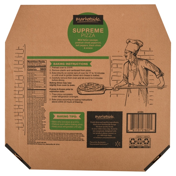 Details Ingredients Crust (unbleached enriched wheat flour [wheat flour, niacin, reduced iron, thiamine mononitrate, riboflavin, folic acid], water, palm oil, yeast, contains 2% or less of: sugar, soybean oil, extra virgin olive oil, salt, natural flavor), sauce (tomato puree [water, tomato paste], sugar, contains 2% or less of: spices, salt, soybean oil, citric acid, xanthan gum, dehydrated onion, garlic powder), low moisture whole milk mozzarella cheese (pasteurized milk, cheese cultures, salt, enzymes), pepperoni, bha, bht, and citric acid added to help protect flavor (pork, salt, contains 2% or less of: beef, dextrose, flavorings, lactic acid starter culture, oleoresin of paprika, sodium nitrite, spices, sodium ascorbate, bha, bht, citric acid), cooked Italian sausage (pork, spices, water, salt, corn syrup solids, dried garlic, paprika, paprika and annatto extract, sugar, lemon juice powder [corn syrup solids, lemon juice solids, lemon oil], flavoring), no smoke provolone cheese (pasteurized milk, cheese cultures, salt, enzymes), contains 2% or less of: red onions, green bell peppers, red bell peppers, yellow bell peppers, black olives (black olives, ferrous gluconate), grated parmesan cheese (parmesan cheese [pasteurized part-skim milk, cheese cultures, salt, enzymes], powdered cellulose [anti-caking agent]), grated romano cheese (romano cheese [pasteurized part-skim cow's milk, cheese cultures, salt, enzymes], powdered cellulose [anti-caking agent]), dehydrated garlic, dried oregano, parsley. Show more Product features Marketside Supreme Pizza starts with a delicious traditional crust that is loaded with tasty toppings including mild Italian sausage, premium sliced pepperoni, bell peppers, black olives and onions. It also features a delicious blend of whole milk mozzarella, parmesan, provolone, and Romano cheese, vine-ripened roma tomato sauce and fresh basil. Our pizzas are crafted with care, using just the right combination of flavorful and wholesome ingredients. Serve it with a fresh Caesar salad, garlic knots or a hot cup of vegetable soup. This pizza is an excellent source of calcium and protein and is USDA inspected. Simply bake for 17 to 19 minutes and enjoy great tasting, restaurant quality pizza right in the comfort of your own home. Treat yourself to a bite of Marketside Supreme Pizza. Fresh ideas and quality ingredients, that's how Marketside brings the best foods to your table. We are committed to deliver freshness that you can taste and see. Marketside offers the best in fresh food, guaranteed by Walmart, working in partnership with farmers, bakers and chefs for the highest quality, authentic ingredients and favorite recipes. BAKING INSTRUCTIONS Preheat oven to 375°F. Remove pizza from packaging. Bake directly on center rack of oven for 17 to 19 minutes. Carefully remove from oven and let cool 2 to 3 minutes before slicing. Baking time may vary slightly from oven to oven. Marketside Traditional Crust Supreme Pizza, Extra Large, 45 oz: Mild Italian sausage, premium slice pepperoni, bell peppers, black olives and onions Topped with a delicious blend of whole milk mozzarella, asiago, parmesan, provolone, and Romano cheese USDA Inspected Traditional Crust Take and bake Easy to bake Net Quantity of Content 9 X 1/9 pizza (142g)