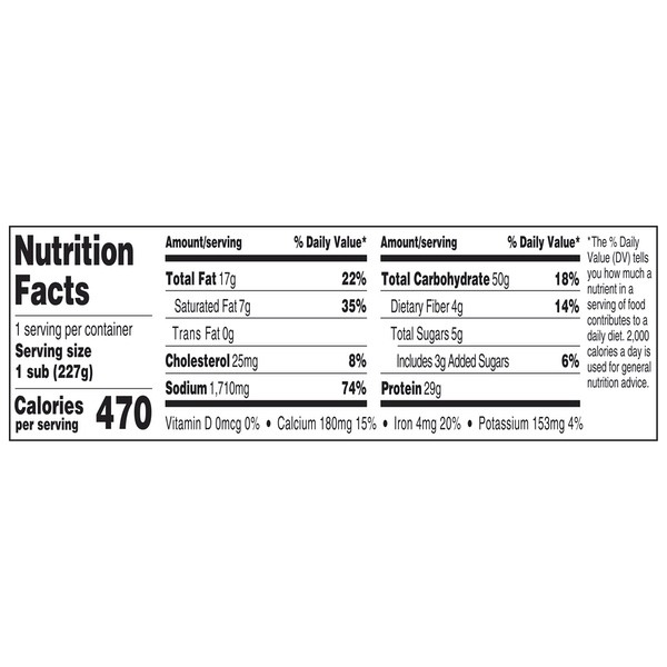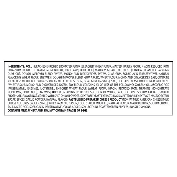 Details Ingredients ROLL (BLEACHED ENRICHED BROMATED FLOUR [BLEACHED WHEAT FLOUR, MALTED BARLEY FLOUR, NIACIN, REDUCED IRON, POTASSIUM BROMATE, THIAMINE MONONITRATE, RIBOFLAVIN, FOLIC ACID], WATER, VEGETABLE OIL BLEND [CANOLA OIL AND EXTRA VIRGIN OLIVE OIL], DOUGH IMPROVER BLEND [WATER, MONO- AND DIGLYCERIDES, DATEM, GUAR GUM, SORBIC ACID {PRESERVATIVE}, NATURAL FLAVORING, WHEAT FLOUR, ENZYMES], DOUGH IMPROVER BLEND [GUM ARABIC, WHEAT FLOUR, MONO- AND DIGLYCERIDES, SALT, CONTAINS 2% OR LESS OF THE FOLLOWING: SOYBEAN OIL, CELLULOSE GUM, GUAR GUM, ENZYMES], SALT, DEXTROSE, YEAST, DOUGH IMPROVER BLEND [WHEAT FLOUR, MONO- AND DIGLYCERIDES, DATEM, SOY FLOUR, CONTAINS 2% OR LESS OF THE FOLLOWING: SOYBEAN OIL, ASCORBIC ACID {PRESERVATIVE}, ENZYMES, L-CYSTEINE], ENRICHED WHEAT FLOUR [WHEAT FLOUR, NIACIN, REDUCED IRON, THIAMINE MONONITRATE, RIBOFLAVIN, FOLIC ACID], ENZYMES), BEEF (CONTAINING UP TO 10% SOLUTION OF WATER, SALT, DEXTROSE, SODIUM LACTATE, SODIUM PHOSPHATE, FLAVORINGS. COATED WITH SALT, ONION POWDER, DEXTROSE, YEAST EXTRACT, BLACK MALTED BARLEY EXTRACT, MALTODEXTRIN, SUGAR, SPICES, GARLIC POWDER, NATURAL FLAVOR), PASTEURIZED PREPARED CHEESE PRODUCT (NONFAT MILK, AMERICAN CHEESE [MILK, CHEESE CULTURES, SALT, ENZYMES], WHEY, PALM OIL, CASEIN, FOOD STARCH-MODIFIED, NATURAL FLAVOR, MALTODEXTRIN, SODIUM CITRATE, SALT, LACTIC ACID, SORBIC ACID [PRESERVATIVE], COLOR ADDED, SOY LECITHIN), ROASTED GREEN PEPPERS, ROASTED ONIONS. Show more Product features Bite into a mouthful of flavor with this Marketside Philly Cheesesteak Sub, packed with all your favorite fillings including beef and cheese with roasted green peppers and onions on a soft artisan roll. This delicious Philly cheesesteak sub is perfect for a quick and easy meal at home, at work or the office, or on the go. Add a side of crispy potato chips and a hot cup of your favorite soup for a hearty meal. Ready to eat in as little as a minute and a half, this sandwich has 29 grams of protein per serving to satisfy your hunger. Treat yourself to a delicious Marketside Philly Cheesesteak Sub. Fresh ideas and quality ingredients, that's how Marketside brings the best foods to your table. We are committed to deliver freshness that you can taste and see. Marketside offers the best in fresh food, guaranteed by Walmart, working in partnership with farmers, bakers and chefs for the highest quality, authentic ingredients and favorite recipes. Marketside Philly Cheesesteak Sub, 8 oz: Heat and eat Ready in 1.5-2 minutes Quick and easy grab-and-go meal Pair with your favorite chips, veggies, or soup 29 grams of protein per serving Net Quantity of Content 1 X 227 g