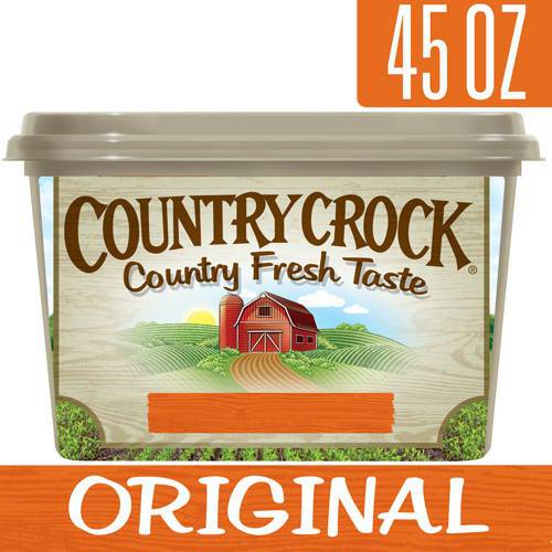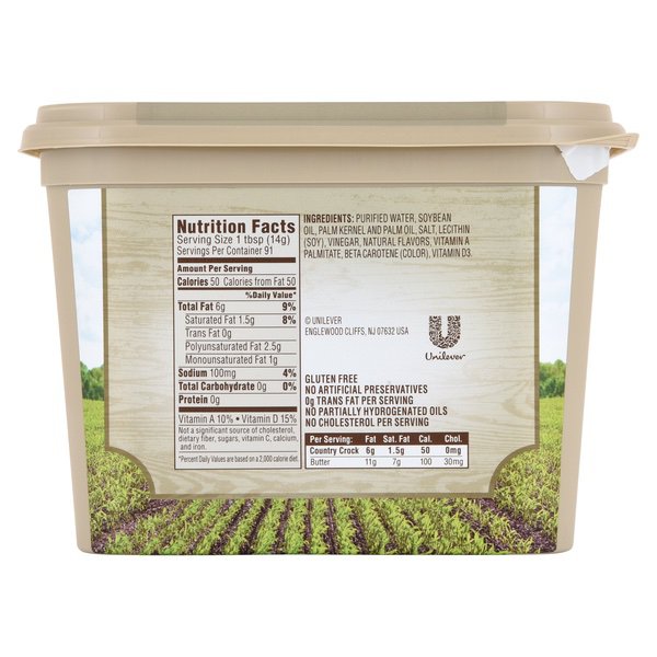 Details Ingredients Purified Water, Soybean Oil, Palm Kernel and Palm Oil, Salt, Lecithin (Soy), Vinegar, Natural Flavors, Vitamin A Palmitate, Beta Carotene (Color), Vitamin D3. Show more Product features Country Crock Original Buttery Spread has a delicious country fresh taste made from real, simple ingredients your whole family will enjoy. This tasty spread is made from ingredients like a blend of delicious oils, purified water, and a pinch of salt with no artificial flavors or preservatives, 0g of trans-fats and no cholesterol per serving. Whether Country Crock is a part of your family mealtimes, or a quick breakfast on-the-go, it makes everything taste delicious! Country Crock has 70% less saturated fat than butter, and only 50 calories per serving. This delicious butter substitute contains no partially hydrogenated oils and is made with simple, high quality ingredients you can feel good about serving your family. Country Crock Original is also a good source of Omega 3-ALA and Omega 6-LA, essential fats which help support kids? normal growth and development. Vegetable Oil Spread, 40%, Original Space saver tub. Real taste from real ingredients. Country fresh taste. No artificial flavors. No artificial preservatives. 0 g trans fat per serving (See nutrition information for fat and saturated fat content). 50 calories per 1 tbsp. Gluten free. No artificial preservatives. 0 g trans fat per serving. No partially hydrogenated oils. No cholesterol per serving. Ingredients you can recognize and pronounce. Per Serving: Country Crock: 6 g fat; 1.5 g sat fat; 50 cal.; 0 mg chol.. Butter: 11 g fat; 7 g sat. fat; 100 cal.; 30 mg chol. Please recycle. Discover more about our products at Learnaboutmyfood.com. Questions or comments? Call 1-800-579-3663. To learn more about how to care for your tub, visit us at CountryCrock.com. Special Features No trans fat Net Quantity of Content 91 X 1 Tbsp