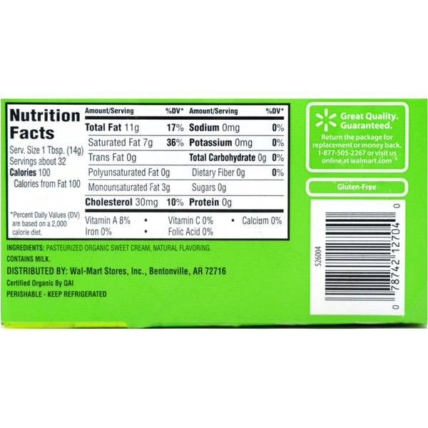 Details Ingredients Pasteurized Organic Sweet Cream, Natural Flavoring Product features Great Value Organic Unsalted Butter USDA Organic Gluten Free
