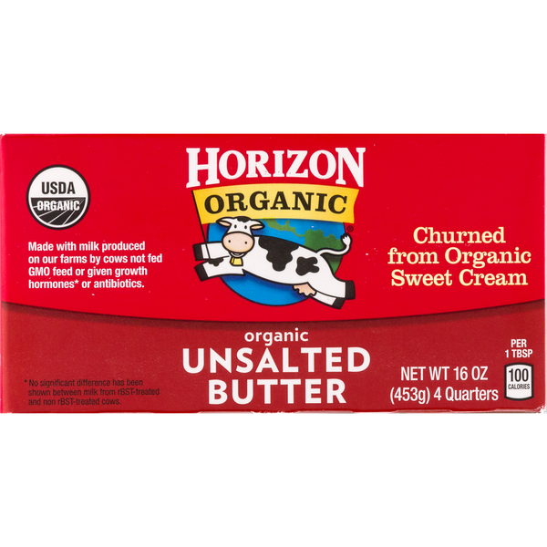 Details Ingredients Organic Grade A Sweet Cream (Milk), Lactic Acid. Product features Horizon Organic Unsalted Butter. The delicious Horizon dairy products your family loves come from our partnership with over 600 certified organic family farmers. It is USDA organic product made with milk produced on our farms by cows not fed GMO feed or given growth hormones or antibiotics and churned from organic sweet cream. Horizon Organic unsalted Butter Sticks, 16oz. 4 count: USDA Organic Churned from organic sweet cream Non GMO 1st quality Special Features Unsalted Net Quantity of Content ABOUT 32 X 1 Tbsp