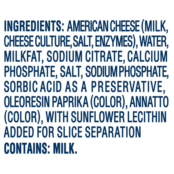 Details Ingredients American Cheese (Milk, Cheese Culture, Salt, Enzymes), Water, Milkfat, Sodium Citrate, Calcium Phosphate, Salt, Sodium Phosphate, Sorbic Acid As A Preservative, Oleoresin Paprika (Color), Annatto (Color), With Sunflower Lecithin Added For Slice Separation Show more Product features Kraft Deli Deluxe American Cheese Slices are creamy, rich and full of flavor. This sliced American cheese features a mild, slightly tangy flavor and smooth texture that goes well with meat and vegetable dishes. Pre-sliced for your convenience, this deli style American cheese is perfect for slipping into sandwiches or snacking on straight from the package. Kraft Deli Deluxe cheeses are made with quality ingredients like pasteurized milk for full flavor and consistency. These slices contain 20% daily value of calcium per serving, see nutrition information for saturated fat and sodium content. Put one of these creamy American cheese slices on any sandwich or burger for the perfect melt, or add them to a cheese sauce to elevate your classic mac and cheese recipe. For optimum flavor, keep this 16 ounce resealable package of 24 American cheese slices in the fridge until use. One 16 oz. package of 24 Kraft Deli Deluxe American Cheese Slices Kraft Deli Deluxe American Cheese Slices elevate your favorite meals Yellow American cheese is slightly tangy and creamy Sliced cheese cuts prep time and melts easily over hot foods Made with milk for quality and consistency Use on sandwiches, burgers, hot dishes and more Resealable package helps lock in flavor Special Features Double the calcium Net Quantity of Content 24.0 X 1 slice (19g)