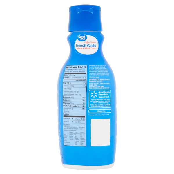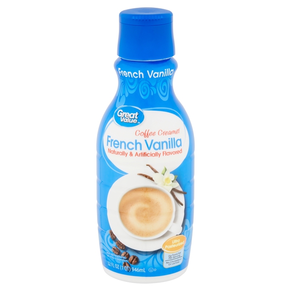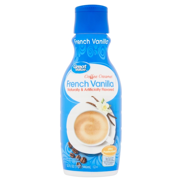 Details Ingredients WATER, SUGAR, PARTIALLY HYDROGENATED SOYBEAN AND COTTONSEED OIL AND LESS THAN 2% OF NATURAL AND ARTIFICIAL FLAVORS, SODIUM CASEINATE (A MILK DERIVATIVE*), DIPOTASSIUM PHOSPHATE, POLYSORBATE 60, MONO AND DIGLYCERIDES, COLOR ADDED, SODIUM STEAROYL LACTYLATE, CARRAGEENAN. Show more Product features Take your morning brew to the next level with Great Value French Vanilla Coffee Creamer. Our coffee creamer contains only 30 tasty, tiny calories and 0 grams of trans fat per serving, making it an excellent choice for those pursuing a healthy lifestyle. Get creative by adding this creamer to homemade ice cream, a creamy smoothie, or your favorite baked treat. You'll look forward to your cup of coffee every morning with this sweet superstar on hand in your fridge. For great flavor at a great price, grab a bottle of Great Value French Vanilla Coffee Creamer today! Great Value products provide families with affordable, high quality grocery and household consumable options. With our wide range of product categories spanning grocery and household consumables, we offer you a variety of products for your family's needs. Our products are conveniently available online and in Walmart stores nationwide, allowing you to stock up and save money at the same time. French vanilla coffee creamer Ultra-pasteurized and gluten-free 0g trans fat per serving No cholesterol or lactose Kosher dairy 32fl oz container Special Features 35 calories per serving Net Quantity of Content 64 X 1 Tbsp