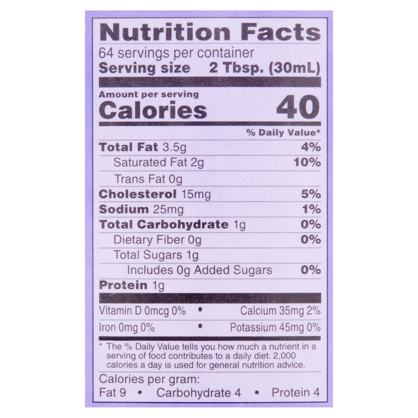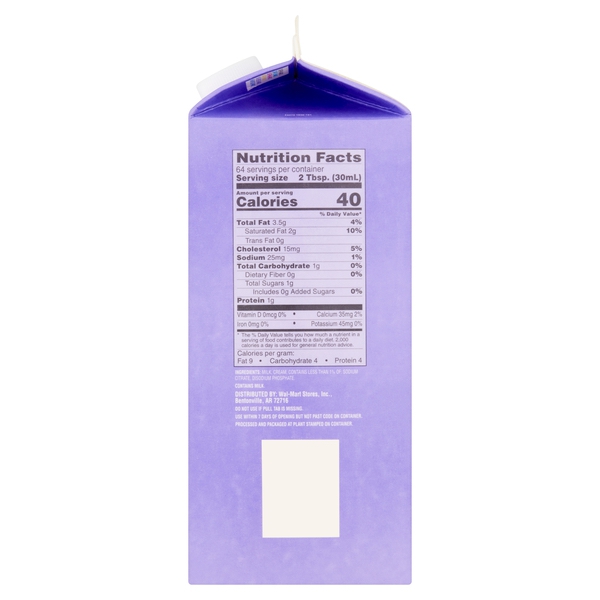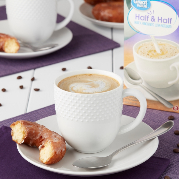 Details Ingredients MILK, CREAM, CONTAINS LESS THAN 1% OF: SODIUM CITRATE, DISODIUM PHOSPHATE. Product features Great Value Half & Half, 64 fl oz Grade A, homogenized Kosher - Dairy Special Features Kosher dairy Net Quantity of Content 64 X 2 Tbsp