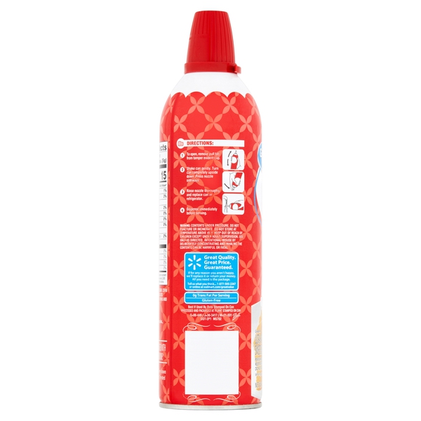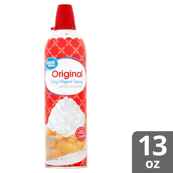 Details Ingredients CREAM, MILK, SUGAR, DEXTROSE, CONTAINS LESS THAN 1% OF: SORBITAN MONOSTEARATE, ARTIFICIAL FLAVOR, CARRAGEENAN, MIXED TOCOPHEROLS (VITAMIN E) TO PROTECT FLAVOR, PROPELLANT: NITROUS OXIDE. Show more Product features Milk from cows not treated with artificial growth hormone* *No significant difference has been shown between milk derived from rBST-treated and non-rBST-treated cows. You will want to put our delicious Great Value Original Dairy Whipped Topping on just about everything! This classic whipped topping is made with real cream and no artificial flavors or sweeteners, so you know you're only getting the highest quality on the shelves. Gently shake, turn the can upside down, and press the nozzle sideways to release the light-as-air cream onto your favorite desserts, fresh fruit, or hot chocolate. Put the finishing touch on strawberry shortcake or a warm brownie sundae for an extra sweet treat. Our fluffy cream makes desserts so mouth-watering you'll want to finish every last bite. The 13-ounce can is perfect to keep in the door of your fridge for whenever the craving strikes. Indulge in this childhood favorite with Great Value Original Dairy Whipped Topping! Great Value products provide families with affordable, high quality grocery and household consumable options. With our wide range of product categories spanning grocery and household consumables, we offer you a variety of products for your family's needs. Our products are conveniently available online and in Walmart stores nationwide, allowing you to stock up and save money at the same time. Made with real cream No artificial flavors or sweeteners Made with milk from artificial-growth-hormone-free, healthy cows Easy release can 13oz Net Quantity of Content 61 X 2 Tbsp