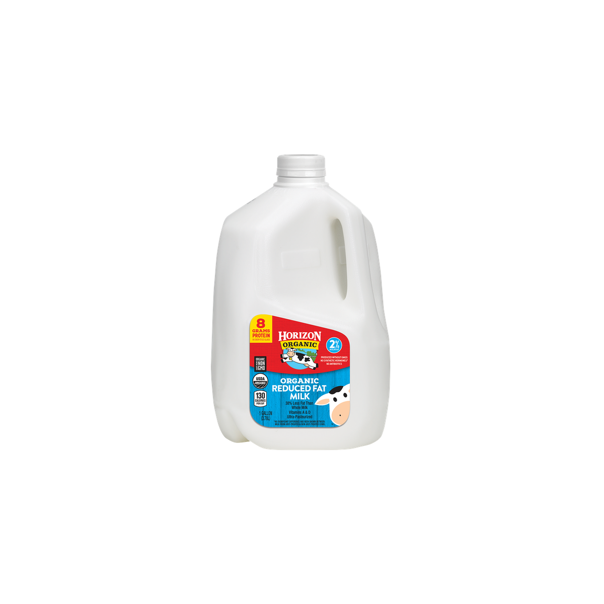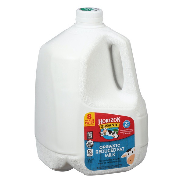 Details Ingredients Grade A Reduced Fat Organic Milk, Vitamin A Palmitate, Vitamin D3. Product features Enjoy cold, creamy Horizon Organic milk in a gallon size-that means fewer trips to the store and more time treating your family to the goodness of organic. And since our milk is certified organic, that means: no GMOs, no antibiotics, no added hormones,* no persistent pesticides and the humane treatment of cows. *No significant difference has been shown between milk from rBST-treated cows. Horizon Organic 2% Reduced Fat Milk 1 Gallon: USDA Organic 8G Protein 2% Reduced Fat Milk Non GMO Net Quantity of Content ABOUT 16 X 1 cup