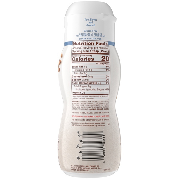 Details Ingredients Coconut Milk (Water, Coconut Cream), Almond Milk (Water, Almonds), Cane Sugar, Coconut Oil, Lemon Juice from Concentrate, Pea Protein, Baking Soda, Natural Flavor, Gellan Gum, Guar Gum (from the Guar Plant). Show more Product features Coffee mate natural bliss® Vanilla Plant Based Half and Half brings a rich, delicious vanilla flavor to your morning cup. It’s made with real almond milk, coconut cream, cane sugar, and natural vanilla flavor that includes extracts from real Madagascar vanilla beans. And GMO ingredients? Not in this plant based half and half. natural bliss® Vanilla Plant Based Half and Half transforms your every cup into a rich and creamy vanilla experience that’s simply beyond compare. Because we only use all-natural ingredients, some separation is expected Made with real almond milk and coconut cream to create the perfect balance of creamy and delicious Only 2g of sugar per serving Creamier than plant-based milks All- natural plant based half and half No artificial ingredients No GMO ingredients Net Quantity of Content 32.0 X 1 Tbsp. (15mL)