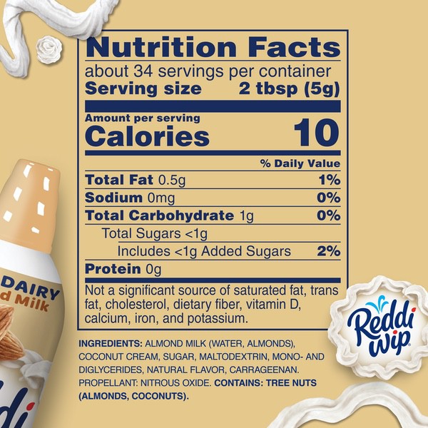 Details Ingredients Almond Milk (Water, Almonds), Coconut Cream, Sugar, Maltodextrin, Mono- and Diglycerides, Natural Flavor, Carrageenan. Propellant: Nitrous Oxide. CONTAINS: TREE NUTS (ALMONDS, COCONUTS). Show more Product features Reddi-wip Non-Dairy Made with Almond Milk is a deliciously creamy whipped topping for everyone, and especially for those who are looking for a vegan or dairy-free option. With no artificial sweeteners or preservatives, this treat is a perfect gluten-free whipped cream alternative to top your favorite fruit, coffee, hot cocoa, or desserts. Enjoy a guilt-free indulgence with 10 calories per serving. Add some real creamy goodness, and savor every bite. Contains one 6-ounce can of Reddi-wip Non-Dairy Made with Almond Milk Vegan Whipped Topping Indulge in this deliciously creamy non-dairy whipped-cream alternative A perfect topping to your favorite fruit, coffee, hot chocolate or dessert A gluten-free treat that's made with real almond milk 10 calories per serving for a tasty guilt-free indulgence No artificial sweeteners or preservatives Net Quantity of Content 34.0 X 5g