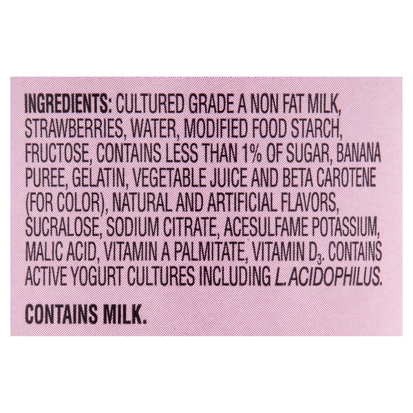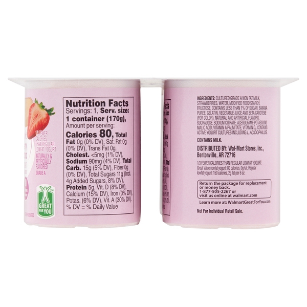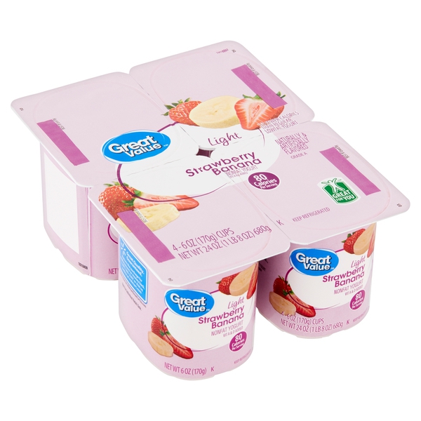Details Ingredients CULTURED GRADE A NON FAT MILK, STRAWBERRIES, WATER, MODIFIED FOOD STARCH, FRUCTOSE, CONTAINS LESS THAN 1% OF SUGAR, BANANA PUREE, GELATIN, VEGETABLE JUICE AND BETA CAROTENE (FOR COLOR), NATURAL AND ARTIFICIAL FLAVORS, SUCRALOSE, SODIUM CITRATE, ACESULFAME POTASSIUM, MALIC ACID, VITAMIN A PALMITATE, VITAMIN D3. Show more Product features 1/3 fewer calories than regular lowfat yogurt: Great Value nonfat yogurt: 80 calories, 0 fat; Regular lowfat yogurt: 150 calories, 2g fat per 6 oz. Enjoy a healthy snack that tastes like dessert with Great Value Light Strawberry Banana Nonfat Yogurt. This yogurt is perfect in the morning topped with some granola and dried fruit or as a complement to your lunch to fight midday hunger. With 0 grams of fat and only 80 tiny, tasty calories, this is a snack you can feel good about. Love the light life with Great Value Light Strawberry Banana Nonfat Yogurt. Great Value products provide families with affordable, high quality grocery and household consumable options. With our wide range of product categories spanning grocery and household consumables, we offer you a variety of products for your family's needs. Our products are conveniently available online and in Walmart stores nationwide, allowing you to stock up and save money at the same time. Vit A & D added Naturally & artificially flavored Grade A 80 calories per serving Kosher Net Quantity of Content 1 X 170 g