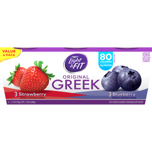 Details Ingredients Strawberry Naturally and Artificially Flavored Cultured Grade A Non Fat Milk, Water, Strawberries, contains less than 1% of Fructose, Modified Food Starch, Black Carrot Juice and Carmine (For Color), Natural and Artificial Flavors, Sucralose, Sodium Citrate, Potassium Sorbate (To Maintain Freshness), Malic Acid, Acesulfame Potassium, Active Yogurt Cultures L. Bulgaricus & S. Thermophilus. Blueberry Naturally and Artificially Flavored Ingerdients: Cultured Grade A Non Fat Milk, Water, Blueberry Puree, Fructose, contains less than 1% of Modified Food Starch, Carmine (For Color), Natural and Artificial Flavors, Sucralose, Malic Acid, Potassium Sorbate (To Maintain Freshness), Acesulfame Potassium, Sodium Citrate, Active Yogurt Cultures L. Bulgaricus & S. Thermophilus. Show more Product features Light & Fit Nonfat Greek Strawberry Yogurt - You'll love the combination of our delicious Greek nonfat yogurt and the taste of strawberries. It's summer in every spoonful-without the sacrifice. Light & Fit Nonfat Greek Blueberry Yogurt - Scoop into the plump, juicy blueberries beneath our creamy Greek nonfat yogurt and give it a swirl for a treat that tastes so satisfying, you won't sacrifice a thing. Light & Fit Nonfat Greek Strawberry & Blueberry Yogurt: 80 Calories per 5.3oz serving 12G Protein 0% Fat Gluten Free Diabetes Friendly Includes: 3 Strawberry and 3 Blueberry Net Quantity of Content 3 X 150.0 G