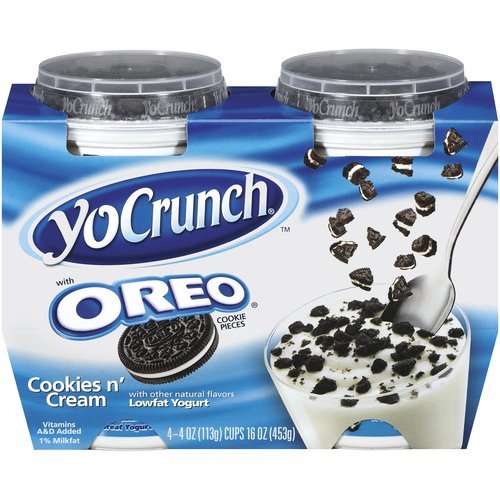 Details Ingredients Lowfat Yogurt: Cultured Pasteurized Grade A Lowfat Milk, Sugar, Food Starch - Modified, Natural Flavors, Potassium Sorbate (To Preserve Freshness), Vitamin A Palmitate, Vitamin D3. Show more Product features Indulge in a tasty treat with this YoCrunch Oreo Cookies N' Cream Low Fat Yogurt. It offers nutritious enjoyment packed in a convenient sized cup. This grade A yogurt is topped with crumbled pieces of Oreo cookie that you can mix in as you eat. This adds a delightful crunchiness to the creamy texture. Made with 1 percent milkfat, it contains vitamins A and D, making it a healthy choice of snack. This item comes in a pack of four cups, each one weighing 4 oz. Pick up YoCrunch yogurt for a nutritious treat that both kids and adults can enjoy. YoCrunch Oreo Cookies N' Cream Lowfat Yogurt, 4 oz, 4-count: Vitamins A and D added 1% milkfat Grade A yogurt with vanilla flavor Kosher dairy Crumbled Oreo cookie on top A fun mix of creamy and crunchy textures Made with other natural flavors A healthy snack that is tasty and fun too Mix the cookies as you eat Net Quantity of Content 4 X 113 g