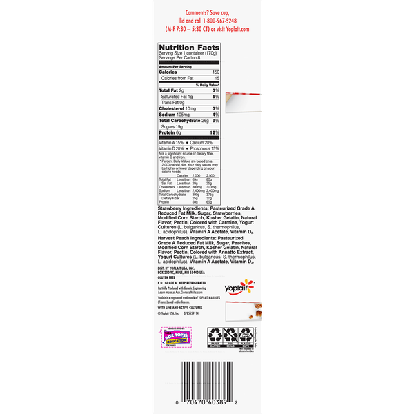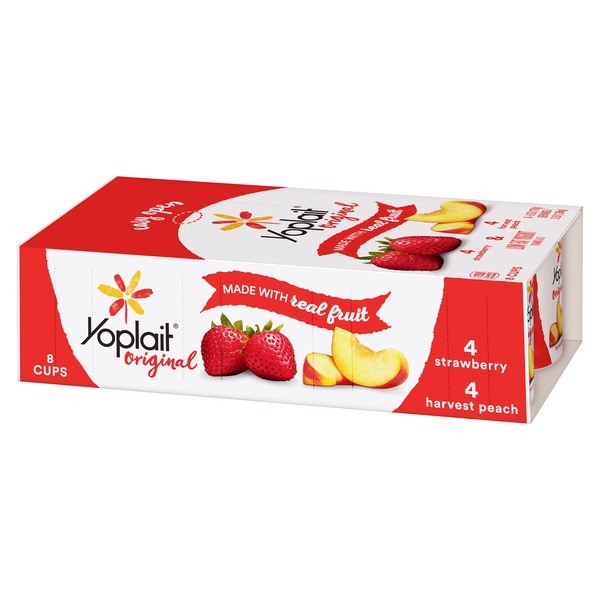 Details Ingredients Strawberry: Cultured Pasteurized Grade A Reduced Fat Milk, Sugar, Strawberries, Modified Corn Starch, Kosher Gelatin, Natural Flavor, Colored with Carmine, Pectin, Vitamin A Acetate, Vitamin D3.Harvest Peach: Cultured Pasteurized Grade A Reduced Fat Milk, Sugar, Peaches, Modified Corn Starch, Kosher Gelatin, Natural Flavor, Pectin, Colored with Annatto Extract, Vitamin A Acetate, Vitamin D3. Show more Product features Yoplait Original variety pack of Strawberry and Harvest Peach flavors. A smooth, creamy delicious yogurt with no high fructose corn syrup and no colors or flavors from artificial sources. A gluten free option that is perfect for breakfast or snack. 4 cups of each flavor. Perfect for the whole family, there are plenty of occasions to enjoy this delicious yogurt! Both flavors in the variety pack are a great choice for everyone in your family.Every spoonful of Yoplait is always smooth, creamy and delicious. So grab your spoon and dive right in – we hope you and your family enjoy every bite! Variety Pack: Creamy original strawberry and harvest peach yogurt for the perfect breakfast on the go or afternoon snack. Made With Goodness: Yogurt contains no artificial flavors, no high fructose corn syrup and no colors from artificial sources. Protein Packed: Yoplait yogurt is packed with 6g of protein per serving. Low Calorie: Low fat yogurt has 150 calories per serving and the same smooth, delicious Yoplait taste. Explore all our Yoplait varieties and flavors Net Quantity of Content 8 X 170.0