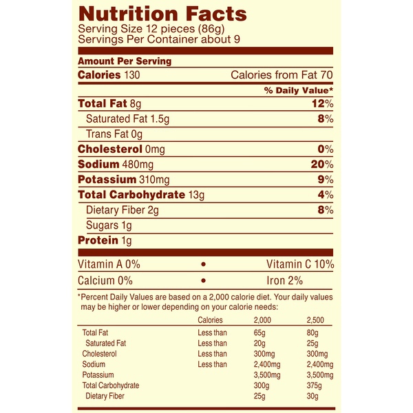 Details Ingredients Potatoes, Vegetable Oil Blend (Soybean And Cottonseed), Salt, Yellow Corn Flour, Dextrose, Sodium Acid Pyrophosphate (To Retain Natural Color), Dehydrated Onion, Sodium Acid Sulfate, Garlic Powder, Celery Seed. Show more Product features Ore-Ida Extra Crispy TATER TOS make it easy to enjoy delicious seasoned potatoes at home. Crispy and golden, these Grade A TATER TOTS are made from freshly peeled, American grown potatoes. These gluten free TATER TOTS offer an extra crispy outside with a fluffy inside for the perfect blend of textures to make your next family meal a success. Toss these frozen TATER TOTS on a baking sheet to bake them in the oven according to package instructions for perfectly crispy tater tots every time. An American classic, these easy tots are made with shredded potatoes and are perfect for dipping. Serve with the traditional burger, or get creative with loaded tots topped with cheese and bacon. These oven baked TATER TOTS come sealed in a 28 ounce bag to help lock in flavor. Your family deserves the highest quality because if it's not Grade A, it's not Ore-Ida! One 28 oz. bag of Ore-Ida Extra Crispy TATER TOTS Ore-Ida Extra Crispy TATER TOTS offer an easy side dish for your meals Gluten free tots Made from the highest quality Grade A potatoes grown in the U.S. Classic TATER TOTS are perfect for dipping in ketchup Enjoy with burgers or in casseroles Sealed in a bag for convenient storage in your freezer Special Features Extra crispy Net Quantity of Content 9.0 X 12 pieces (86g)