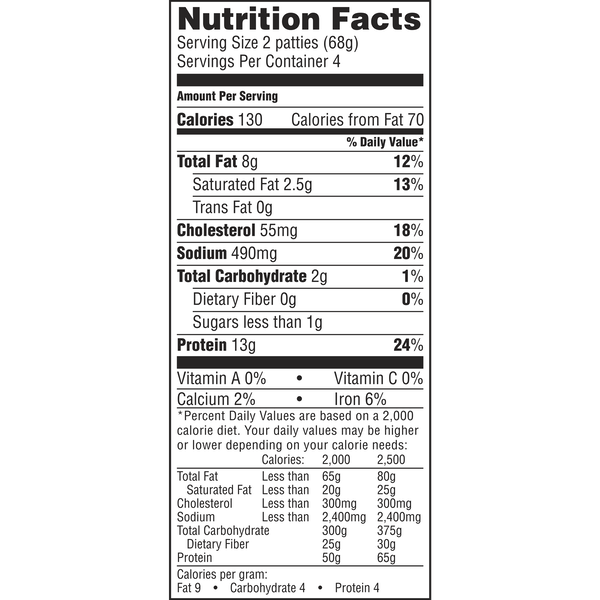 Details Ingredients TURKEY, WATER, CONTAINS 2% OR LESS: POTASSIUM LACTATE, SALT, SPICES, SODIUM PHOSPHATE, DEXTROSE, SUGAR, SODIUM PROPIONATE, SODIUM DIACETATE, BHT, CITRIC ACID, CARAMEL COLOR. Show more Product features Celebrate the day and the delightful taste of Jimmy Dean® Fully Cooked Turkey Sausage Patties. Made with premium turkey, seasoned to perfection with our signature blend of spices, these savory sausage patties have 11 grams of protein per serving to give you more fuel to power your day. Simple to prepare and ready in minutes, just microwave and serve with eggs and toast for a traditional breakfast or with biscuits and gravy for brunch. Includes one package of 8 patties. Can breakfast sausage make the world a brighter place? At Jimmy Dean®, we believe that when you have a good breakfast, you have a good day. When you have a good day, you pass that shine onto others. To us, the sun is always shining in the morning. So let's do it. Let's make the world a better place, one breakfast at a time. One package of 8 Turkey Sausage PattiesFully cooked sausage made with premium turkeySeasoned to perfection with our signature blend of spicesGood source of protein - 11 grams per servingSimply microwave and serveDelicious addition to any mealMicrowave and serve with eggs and toast for a traditional breakfast or with biscuits and gravy for brunch Special Features 2 stay fresh packages Net Quantity of Content 4 X 68 g