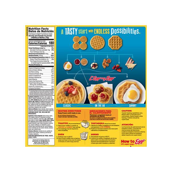 Details Ingredients ENRICHED FLOUR (WHEAT FLOUR, NIACIN, REDUCED IRON, VITAMIN B1, [THIAMIN MONONITRATE], VITAMIN B2 [RIBOFLAVIN], FOLIC ACID), WATER, VEGETABLE OIL (SOYBEAN, PALM AND/OR CANOLA OIL), SUGAR, DEXTROSE, EGGS, CONTAINS 2% OR LESS OF LEAVENING (BAKING SODA, SODIUM ALUMINUM PHOSPHATE, MONOCALCIUM PHOSPHATE), WHEAT FLOUR, MODIFIED CORN STARCH, SALT, MALTODEXTRIN, BLACK CARROT JUICE CONCENTRATE FOR COLOR, BLUEBERRY JUICE CONCENTRATE FOR COLOR, NATURAL FLAVOR, BLUEBERRIES, WHEY, SOY LECITHIN. VITAMINS AND MINERALS: CALCIUM CARBONATE, VITAMIN A PALMITATE, REDUCED IRON, NIACINAMIDE, VITAMIN B6 (PYRIDOXINE HYDROCHLORIDE), VITAMIN B1 (THIAMIN HYDROCHLORIDE), VITAMIN B2 (RIBOFLAVIN), VITAMIN B12. Show more Product features Wake up and greet the day with the feel-good taste of Eggo Blueberry Waffles. Crafted with delicious ingredients and the flavor of tasty blueberries, our waffles are a perfect balance of crispy, fluffy goodness. Convenient and easy to prepare, Eggo Blueberry Waffles bring warmth to busy mornings. Great for families and individuals, these delicious waffles are made to enjoy as a stand-alone breakfast treat or with your favorite morning toppings like butter and syrup, jellies and preserves, and whipped cream. With colors and flavors from natural sources, our waffles also provide a good source of 9 vitamins and minerals. So delicious you can't just L'Eggo! Kellogg's Eggo Blueberry Waffles Easy Breakfast 29.6 Oz 24 Ct The yummy taste of your favorite classic Eggo waffle with a sweet berry flavor in every bite Crisp, golden and fluffy, our waffles are made with delicious ingredients and the flavor of blueberries for an irresistible homemade taste Good source of 9 vitamins and minerals; Colors and flavors from natural sources; Kosher Dairy Quick, convenient, and easy to prepare; Just pop in the toaster or oven for a warm family-favorite breakfast; Great for kids and adults Includes 1, 29.6-ounce family-sized box containing 24 waffles; Packaged for great taste Special Features Good source of calcium Net Quantity of Content 12 X 70 g