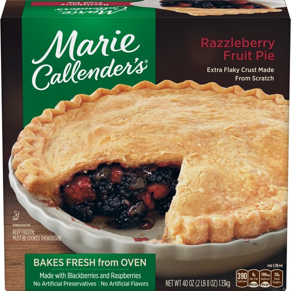Details Ingredients Filling: Blackberries, Sugar, Water, Raspberries, Apples, Modified Corn Starch, Corn Starch, Salt. Crust: Enriched Wheat Flour (Wheat Flour, Niacin, Reduced Iron, Thiamine Mononitrate, Riboflavin, Folic Acid), Soybean Oil, Hydrogenated Soybean Oil, Water, Dextrose, Salt. CONTAINS: WHEAT. Show more Product features Give your taste buds a real treat that's daring, delightful, and delicious with Marie Callender's Razzleberry Pie, 40 oz. It combines the ideal pairing of sweet, juicy blackberries and ripe red raspberries by baking them together in her legendary, made-from-scratch flaky pastry crust. To further enhance the flavor of this Marie Callender's dessert add a dollop of Reddi Wip topping. It has no artificial flavors, no cholesterol and provides 2g of protein and 390 calories per serving. Marie Callender's Razzleberry Pie, 40 oz, is both delicious and convenient.. Marie's story begins over 60 years ago when Marie Callender first baked pies for local restaurants. Marie used only the finest ingredients and put such love and care into every pie--and soon she began offering her home cooking and legendary pies at a pie shop of her own. Now you can enjoy the warmth and goodness of Marie's freshly baked pies at home with Marie Callender's Razzleberry Pie. Marie creates the perfect pairing of ripe red raspberries and sweet, juicy blackberries by baking them together in her legendary flaky pastry crust. The combination is daring, delightful, and downright delicious. Marie Callender's Razzleberry Pie: Extra-flaky crust made from scratch Made with raspberries and blackberries "From my kitchen to yours since 1948" Fruit pie 2g protein, 390 calories per serving Frozen razzleberry pie, 40 oz. Special Features Famous flaky crust Net Quantity of Content 9.0 X 126g