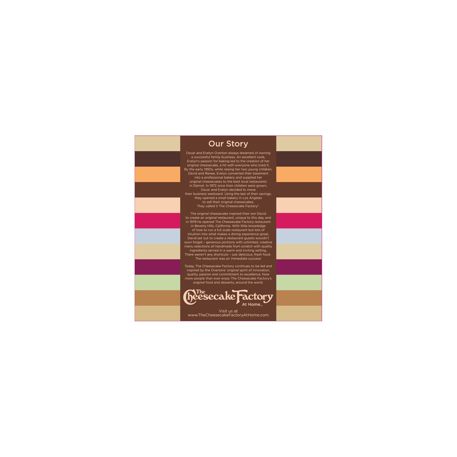 Details Ingredients CREAM CHEESE (PASTEURIZED MILK AND CREAM, CHEESE CULTURE, SALT, STABILIZERS [CAROB BEAN AND/OR XANTHAN AND/OR GUAR GUMS]), SUGAR, SOUR CREAM (PASTEURIZED GRADE A CULTURED MILK, CREAM, NONFAT MILK SOLIDS, ENZYMES), WHOLE EGGS, GRAHAM CRUMB (WHEAT FLOUR, WHOLE WHEAT FLOUR, CANE SUGAR, PALM OIL, HONEY, SODIUM BICARBONATE, SALT), VANILLA CRUMB (WHEAT FLOUR, CANE SUGAR, PALM OIL, WHEY [MILK], SALT, SODIUM BICARBONATE, NATURAL BUTTER VANILLA FLAVOR), MARGARINE (PALM OIL, PALM FRACTIONS, WATER, SALT, EMULSIFIERS [SOYA LECITHIN, DISTILLED MONOGLYCERIDES], NATURAL BUTTER FLAVOR, CITRIC ACID [AS ANTIOXIDANT], VITAMIN A & BETA-CAROTENE), ARTIFICIAL VANILLA FLAVOR, CINNAMON. Show more Product features The Cheesecake Factory at Home Original Cheesecake - Our famous creamy cheesecake with a graham cracker crust Cheesecake Factory Original Cheesecake Net Quantity of Content 8 X 120 g