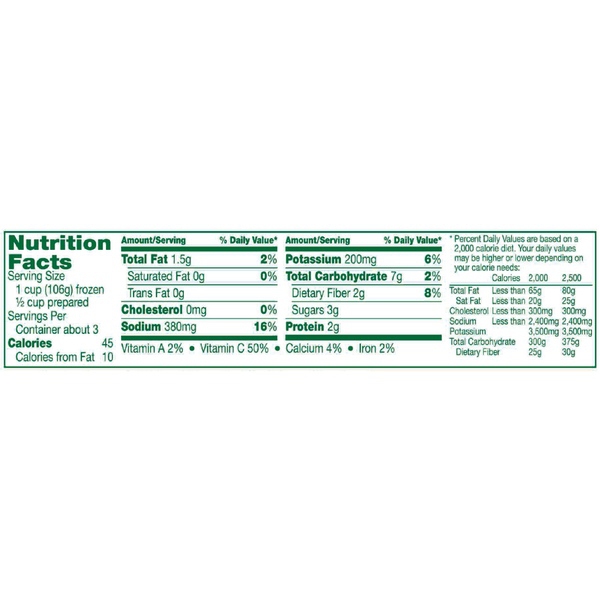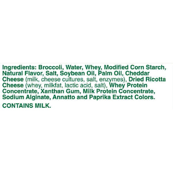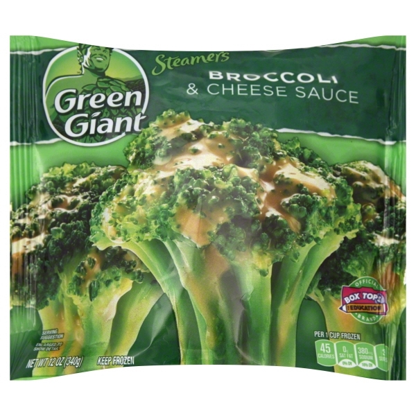 Details Ingredients BROCCOLI, WATER, WHEY, MODIFIED CORN STARCH, NATURAL FLAVOR, SALT, SOYBEAN OIL, PALM OIL, CHEDDAR CHEESE (MILK, CHEESE CULTURES, SALT, ENZYMES), DRIED RICOTTA CHEESE (WHEY, MILKFAT, LACTIC ACID, SALT), WHEY PROTEIN CONCENTRATE, XANTHAN GUM, MILK PROTEIN CONCENTRATE, SODIUM ALGINATE, ANNATTO AND PAPRIKA EXTRACT COLORS. Show more Product features Broccoli & Cheese Sauce, Steamers, Bag 12 OZ Now! More florets. No artificial flavors or preservatives. Official Box Tops for Education brand. Per 1 Cup Frozen: 45 calories; 0 g sat fat (0% DV); 380 mg sodium (16% DV); 3 g sugars. The abundant variety of Green Giant sauced vegetable blends will make sure you and your family enjoy the vegetables you need to live a balanced lifestyle. See how we lock in freshness at www.GreenGiant.com. how2recycle.info. Questions or Comments? Call 1-800-754-3381 Mon-Fri 7:30 am - 5:30 pm CT. Carbohydrate Choice: 1/2. Product of Mexico. Keep frozen. For food safety and quality, follow the cooking directions. Before eating, cook thoroughly to at least 160 degrees F as measured by an instant-read food thermometer. Keep frozen until ready to cook. Adjust cook times as needed. Refrigerate leftovers. Microwave Directions: 1. Place unopened bag standing up on microwavable dinner plate. 2. Microwave on high according to chart until thoroughly cooked. 3. Let stand 1 minute in microwave. Carefully remove plate and bag. Caution: Hot! Avoid steam! Tear bag at notch. Empty into serving dish; stir well. Microwave Wattage (Microwave wattages vary; adjust cook time for the wattage of your microwave): 1200, Time on High: 5 to 6 minutes; Microwave Wattage: 1000, Time on High: 6 to 8 minutes; Microwave Wattage: 700, Time on High: 8 to 9 minutes. Do not leave microwave unattended. Contains milk. Caution! Hot steam! 12 oz (340 g) Parsippany, NJ 07054 800-754-3381 2016 B&G Foods North America, Inc. Broccoli & Cheese Sauce, Sauced Now! More florets. No artificial flavors or preservatives. Official Box Tops for Education brand. Per 1 Cup Frozen: 45 calories; 0 g sat fat (0% DV); 380 mg sodium (16% DV); 3 g sugars. The abundant variety of Green Giant sauced vegetable blends will make sure you and your family enjoy the vegetables you need to live a balanced lifestyle. See how we lock in freshness at www.GreenGiant.com. how2recycle.info. Questions or Comments? Call 1-800-754-3381 Mon-Fri 7:30 am - 5:30 pm CT. Carbohydrate Choice: 1/2. Product of Mexico. Special Features 100% natural Net Quantity of Content 3 X 1 cup