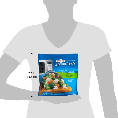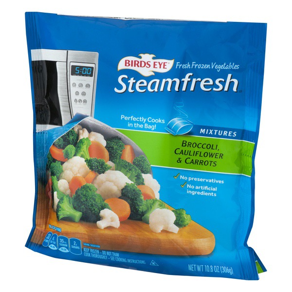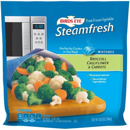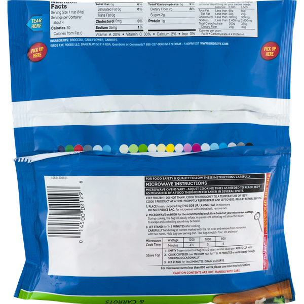 Details Ingredients BROCCOLI, CAULIFLOWER, CARROTS. Product features Broccoli, Cauliflower & Carrots, Mixtures, Steamfresh, Bag 10.8 OZ Fresh frozen vegetables. Perfectly cooks in the bag! Mixtures. No preservatives. No artificial ingredients. Per 1 Cup Serving: 30 calories; 0 g sat fat (0% DV); 35 mg sodium (1% DV); 2 g sugars. Questions or comments? 888-327-9060 M-F 9:00 AM - 5:00 PM EST. www.BirdsEye.com. Mexico; USA. Keep frozen - do not thaw. Cook thoroughly. See cooking instruction. For food safety & quality follow these instructions carefully: Microwave Instructions: Microwave ovens vary - Adjust cooking times as needed to reach 165 degrees F as measured by a food thermometer taken in several spots. Cook thoroughly to a temperature of 165 degrees F. Cook 1 product at a time. Promptly refrigerate any leftovers. Reheat before serving. 1. Place frozen, unopened bag this side up, laying flat in microwave. Do not pierce bag. For microwaves with a metal rack, remove rack. 2. Microwave on high for the recommended cook time based on your microwave wattage. During cooking, the bag will slowly inflate. A special vent in the bag will allow the steam to escape and a whistling sound may be heard. 3. Let stand for 1-2 minutes after cooking. Carefully handle bag at corners marked with the red ovals and remove from microwave with two hands. Hold bag over serving dish. Tear bag at notch. Pour, stir and enjoy. Microwave Cook Time: 1200 Wattage: 4-1/2 minutes. 1000 Wattage: 5 minutes. 800 Wattage: 6 minutes. Stove Top: 1. Empty frozen contents of bag into a 2-quart nonstick sauce pan. Add 1/4 cup water. 2. Cook covered over medium heat for 11 to 12 minutes or until heated through, stirring occasionally. 3. Let stand for 1-2 minutes. Drain and serve. For microwave ovens less than 800 watts please use stove top instructions. Caution contents are hot. Handle with care. This side up. Laying flat when microwaving. Caution! Contents are hot! 10.8 oz (306 g) Darien, WI 53114 888-327-9060 Broccoli, Cauliflower & Carrots Fresh frozen vegetables. Perfectly cooks in the bag! Mixtures. No preservatives. No artificial ingredients. Per 1 Cup Serving: 30 calories; 0 g sat fat (0% DV); 35 mg sodium (1% DV); 2 g sugars. Questions or comments? 888-327-9060 M-F 9:00 AM - 5:00 PM EST. www.BirdsEye.com. Mexico; USA. Net Quantity of Content ABOUT 4 X 1 cup
