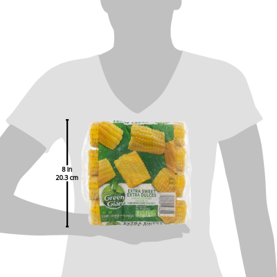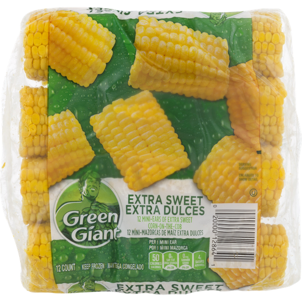 Details Ingredients Sweet Corn-On-The-Cob. Product features Corn-on-the-Cob, Mini, Extra Sweet, Shrink Wrapped 12 CT Per 1 Mini Ear: 50 calories; 0 g sat fat (0% DV); 0 mg sodium (0% DV); 4 g sugars. Enjoy delicious sweet corn on the cob anytime year round with Nibblers. Available in quantities of 6, 12, and 24 mini-ears of corn. See how we lock freshness at www.GreenGiant.com. Exchange: 1 starch. Carbohydrate Choices: 1. Product of USA. Keep frozen. For food safety and quality, follow the directions and cook thoroughly to at least 160 degrees (F). Keep frozen until ready to use. Because stove-tops and microwaves vary, adjusting cook times and heat settings may be required. Refrigerate leftovers. Stove-Top: 1. Place desired amount of frozen corn-on-the-cob in large sauce pan. Add cold water to cover corn. Heat to boiling water over high heat. 2. Cover; reduce heat slightly. Boil 8-10 minutes or until thoroughly heated. Do not overcook. Remove from water with tongs. Microwave: 1. Place 1/4 cup water and up to 8 ears of frozen corn-on-the-cob in 8-inch square (2-quart) microwavable dish. 2. Cover; microwave on high as directed below, turning corn over halfway through cook time, until throughly heated. Do not overcook. Caution: Hot! Avoid steam! Remove from water with tongs. 2 ears 6 to 12 minutes. 4 ears 10 to 16 minutes. 6 ears 12 to 18 minutes. 8 ears 14 to 20 minutes. Do not refreeze. 12 Ears Minneapolis, MN 55440 800-754-3381 2013 General Mills Corn-On-The-Cob, Mini-Ears, Extra Sweet Per 1 Mini Ear: 50 calories; 0 g sat fat (0% DV); 0 mg sodium (0% DV); 4 g sugars. Enjoy delicious sweet corn on the cob anytime year round with Nibblers. Available in quantities of 6, 12, and 24 mini-ears of corn. See how we lock freshness at www.GreenGiant.com. Exchange: 1 starch. Carbohydrate Choices: 1. Product of USA. Special Features Green giant Net Quantity of Content 12 X 61 g