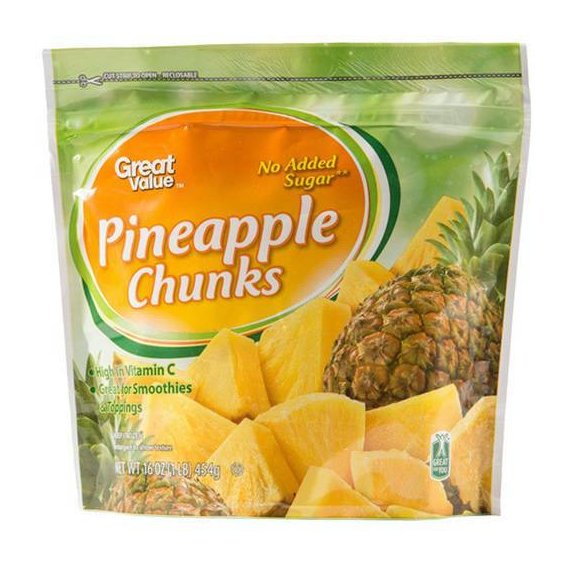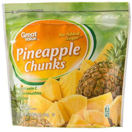 Details Ingredients PINEAPPLE Product features Add some sweetness to your day with Great Value Pineapple Chunks. They are great for homemade smoothies and snacks. Serve them up plain or topped with whipped cream for a delicious treat. Add to fruit salads, ice cream, yogurt or milkshakes. Use them to top off cereal, pancakes or waffles. They are also great as a topping on cheesecake and other dessert recipes. They offer nutritional benefits as they are a good source of dietary fiber and contain no added sugar. Enhance the flavors of your smoothies with the addition of Great Value Pineapple Chunks. Great Value products provide families with affordable, high quality grocery and household consumable options. With our wide range of product categories spanning grocery and household consumables, we offer you a variety of products for your family's needs. Our products are conveniently available online and in Walmart stores nationwide, allowing you to stock up and save money at the same time. Great Value Frozen Pineapple Chunks, 16 oz Perfect for smoothies and snacks Given Walmart's Great For You seal Resealable bag to maintain freshness Top waffles, pancakes, cheesecakes, and more Net Quantity of Content 3 X 1 cup (140g)