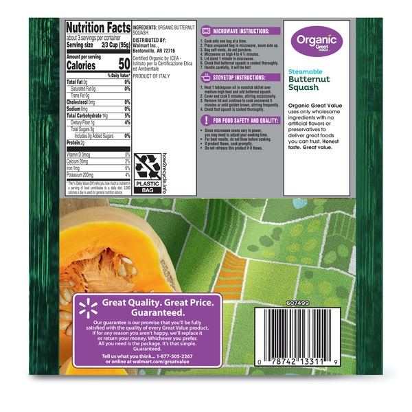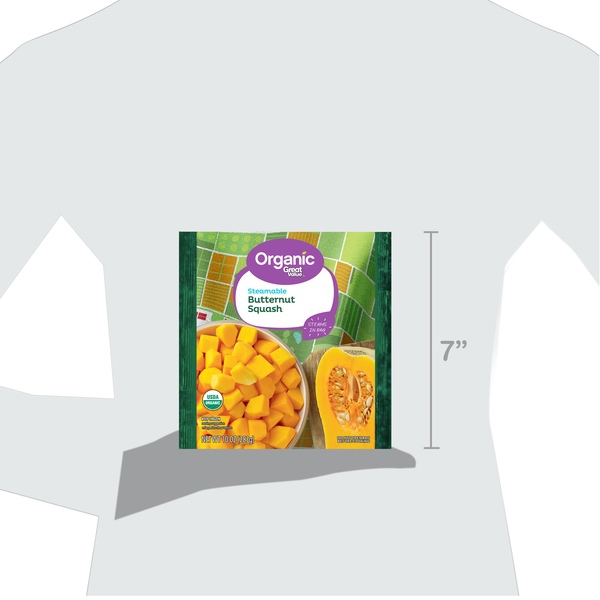 Details Ingredients ORGANIC BUTTERNUT SQUASH Product features Great Value Organic Steamable Butternut Squash is a delicious and easy side dish that is perfect when you’re looking for a nutritious side that’s quick to prepare. This squash steams right in the bag! Butternut Squash is low in fat and delivers an abundance of dietary fiber, making it a healthy choice. The frozen organic Butternut Squash allows you all the convenience of your canned vegetables with no can openers or pantry-cramming necessary. With Great Value’s organic butternut squash, your friends and family can enjoy food without having to worry about artificial ingredients. For tasty, organic frozen vegetables from a brand you can trust, try Great Value Organic Steamable Butternut Squash. Great Value products provide families with affordable, high quality grocery and household consumable options. With our wide range of product categories spanning grocery and household consumables, we offer you a variety of products for your family's needs. Our products are conveniently available online and in Walmart stores nationwide, allowing you to stock up and save money at the same time. Great Value Organic Steamable Butternut Squash, 10 oz: USDA Certified organic butternut squash Steams right in the bag Healthy side dish or ingredient for your favorite recipes No artificial flavors or preservatives Net Quantity of Content ABOUT 3 X 2/3 cup