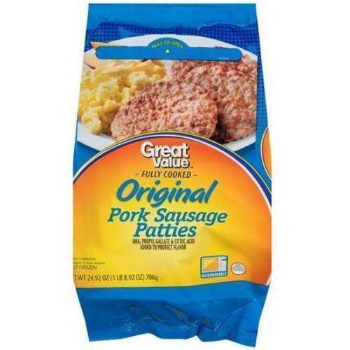 Details Ingredients Pork, Water, Salt, Spices, Corn Syrup, Dextrose, BHA, Propyl Gallate, Citric Acid. Product features Add some delicious flavor to your breakfast with Great Value Original Pork Sausage Patties. Carefully sealed to keep the contents fresh, you can enjoy some Great Value breakfast sausage with your eggs and cereal in the morning. Serve them with pancakes, waffles or a Southern-style biscuits and gravy. Crumble up these pork sausage patties and add them to an omelet along with some cheese, onions, bell peppers and spices. You could also create a savory breakfast sandwich with a toasted English muffin and American cheese. They are microwavable, easy to prepare and simply delicious. Get your mornings off to a good start with Great Value Original Pork Sausage Patties. Great Value products provide families with affordable, high quality grocery and household consumable options. With our wide range of product categories spanning grocery and household consumables, we offer you a variety of products for your family's needs. Our products are conveniently available online and in Walmart stores nationwide, allowing you to stock up and save money at the same time Great Value Original Pork Sausage Patties, 24.92 oz Great with eggs, pancakes and waffles Frozen for long keeping Fully cooked Great with other brunch items Microwavable