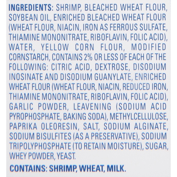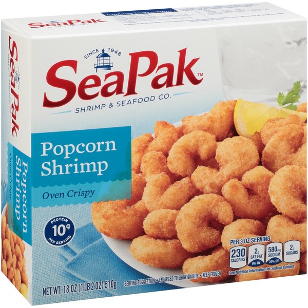 Details Ingredients SHRIMP, BLEACHED WHEAT FLOUR, SOYBEAN OIL, ENRICHED BLEACHED WHEAT FLOUR (WHEAT FLOUR, NIACIN, IRON AS FERROUS SULFATE, THIAMINE MONONITRATE, RIBOFLAVIN, FOLIC ACID), WATER, YELLOW CORN FLOUR, MODIFIED CORNSTARCH, CONTAINS 2% OR LESS OF EACH OF THE FOLLOWING: CITRIC ACID, DEXTROSE, DISODIUM INOSINATE AND DISODIUM GUANYLATE, ENRICHED WHEAT FLOUR (WHEAT FLOUR, NIACIN, REDUCED IRON, THIAMINE MONONITRATE, RIBOFLAVIN, FOLIC ACID), GARLIC POWDER, LEAVENING (SODIUM ACID PYROPHOSPHATE, BAKING SODA), METHYLCELLULOSE, PAPRIKA OLEORESIN, SALT, SODIUM ALGINATE, SODIUM BISULFITES (AS A PRESERVATIVE), SODIUM TRIPOLYPHOSPHATE (TO RETAIN MOISTURE), SUGAR, WHEY POWDER, YEAST. Show more Product features Delicious Seafood, Trusted QualityAt SeaPak, seafood sustainability is our never-ending mission. We're proud of our ability to deliver the highest-quality, most-sustainable products available, conserve natural resources, and drive positive change in the industry, to ensure delicious seafood can be enjoyed by generations to come. Popcorn Shrimp, Oven Crispy Since 1948. Delicious Seafood, Trusted Quality: At SeaPak, seafood sustainability is our never-ending mission. We're proud of our ability to deliver the highest-quality, most-sustainable products available, conserve natural resources, and drive positive change in the industry, to ensure delicious seafood can be enjoyed by generations to come. Committed to sustainability. 10 g Protein per serving. Per 3 oz Serving: 230 calories; 2 g sat fat (9% DV); 580 mg sodium (24% DV); 2 g sugars. See nutrition information for sodium content. Shrimp is Good Food: The USDA recommends eating at least 8 oz of seafood a week for a healthier diet. These shrimp are wild caught. www.seapak.com/smartsourcing. Visit us at www. seapak.com. Facebook. Instagram. YouTube. Processed in the USA. Special Features Popcorn shrimp Net Quantity of Content 6 X 85 g